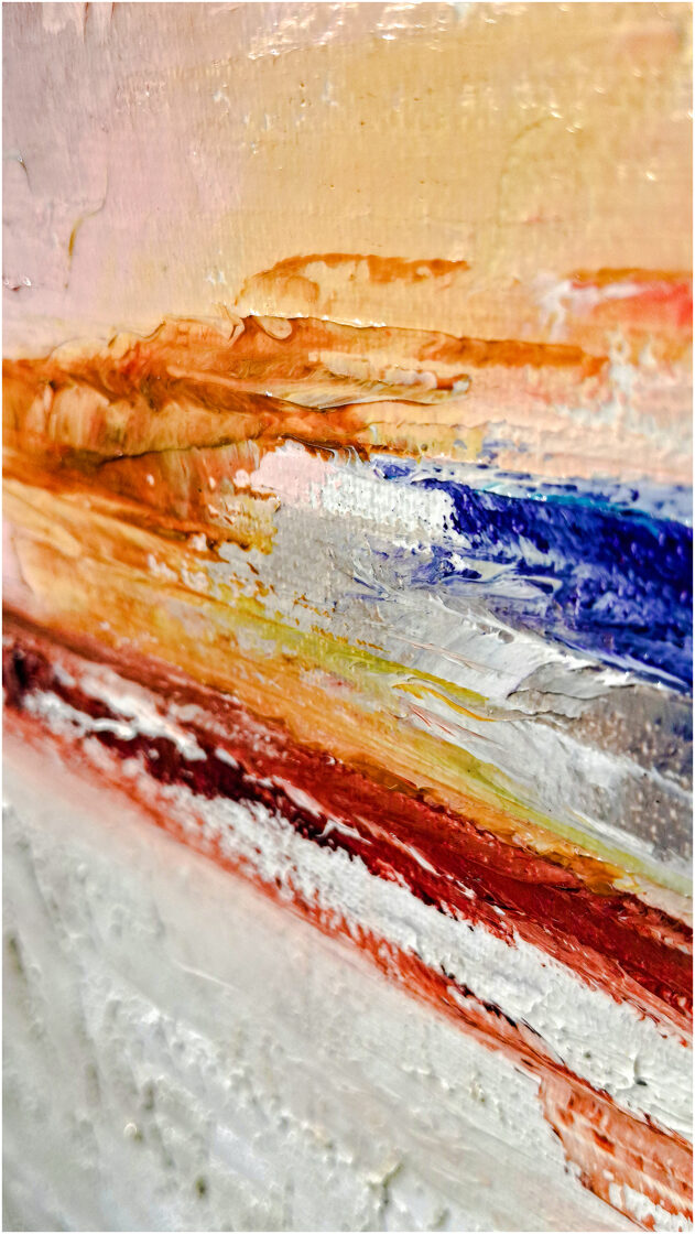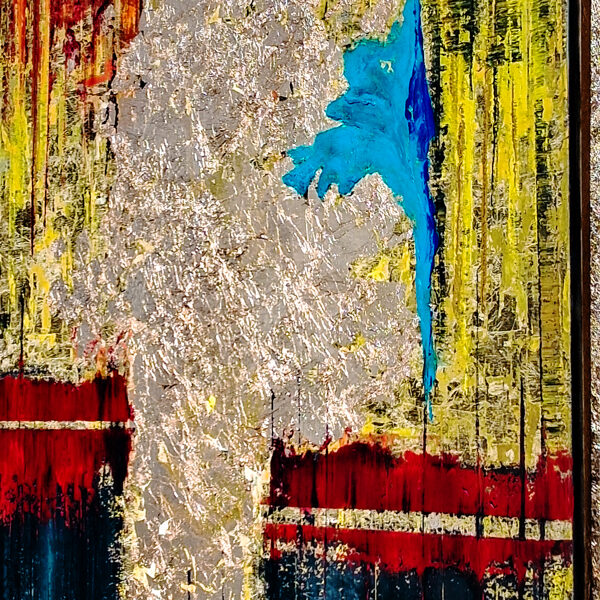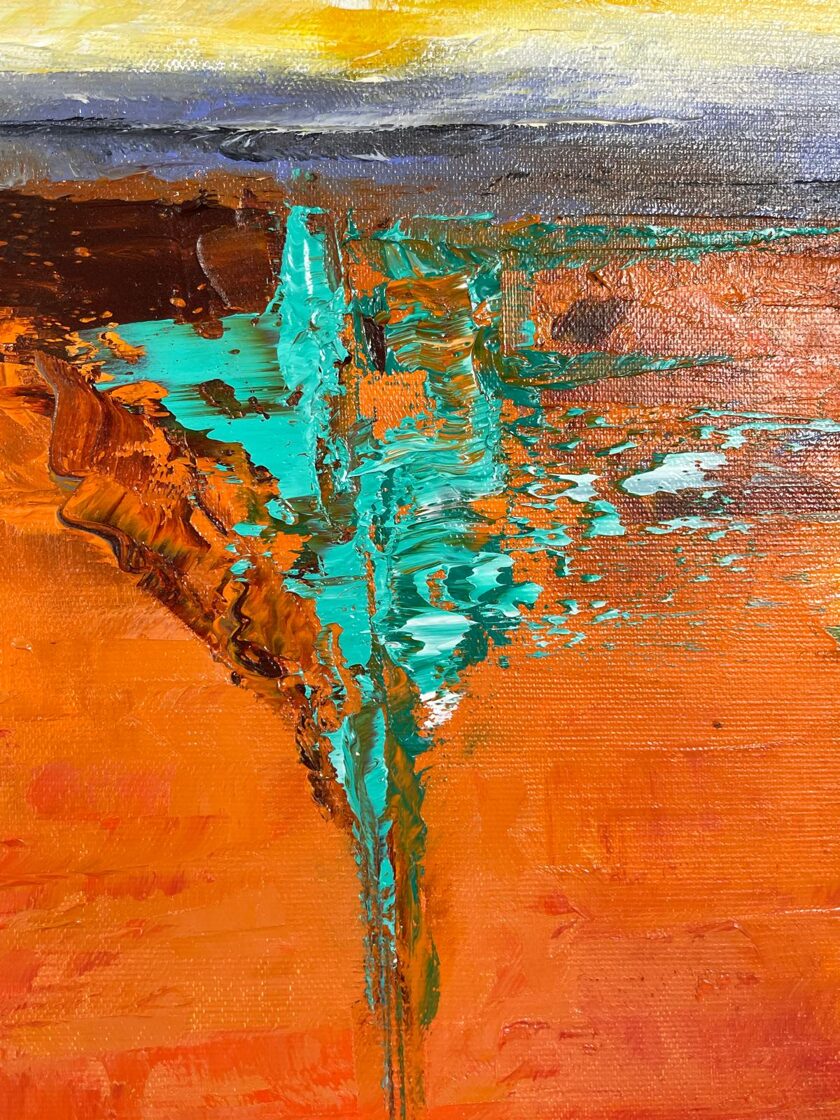 Alekszandrosz útja a Szíva-oázisba nem egyszerűen földrajzi mozgás, hanem szakrális átkelés, egy emberi sors átlépése az isteni rend felé. A festmény első pillantásra széttöredezett, nyugtalan felületei erről az átmenetről mesélnek: a vörös a küzdelmek hevét és a test gyötrelmét, a sárga az isteni fény ígéretét, míg a fehéres, kőzetre emlékeztető alap az örök, szilárd sivatag időtlen arcát idézi.