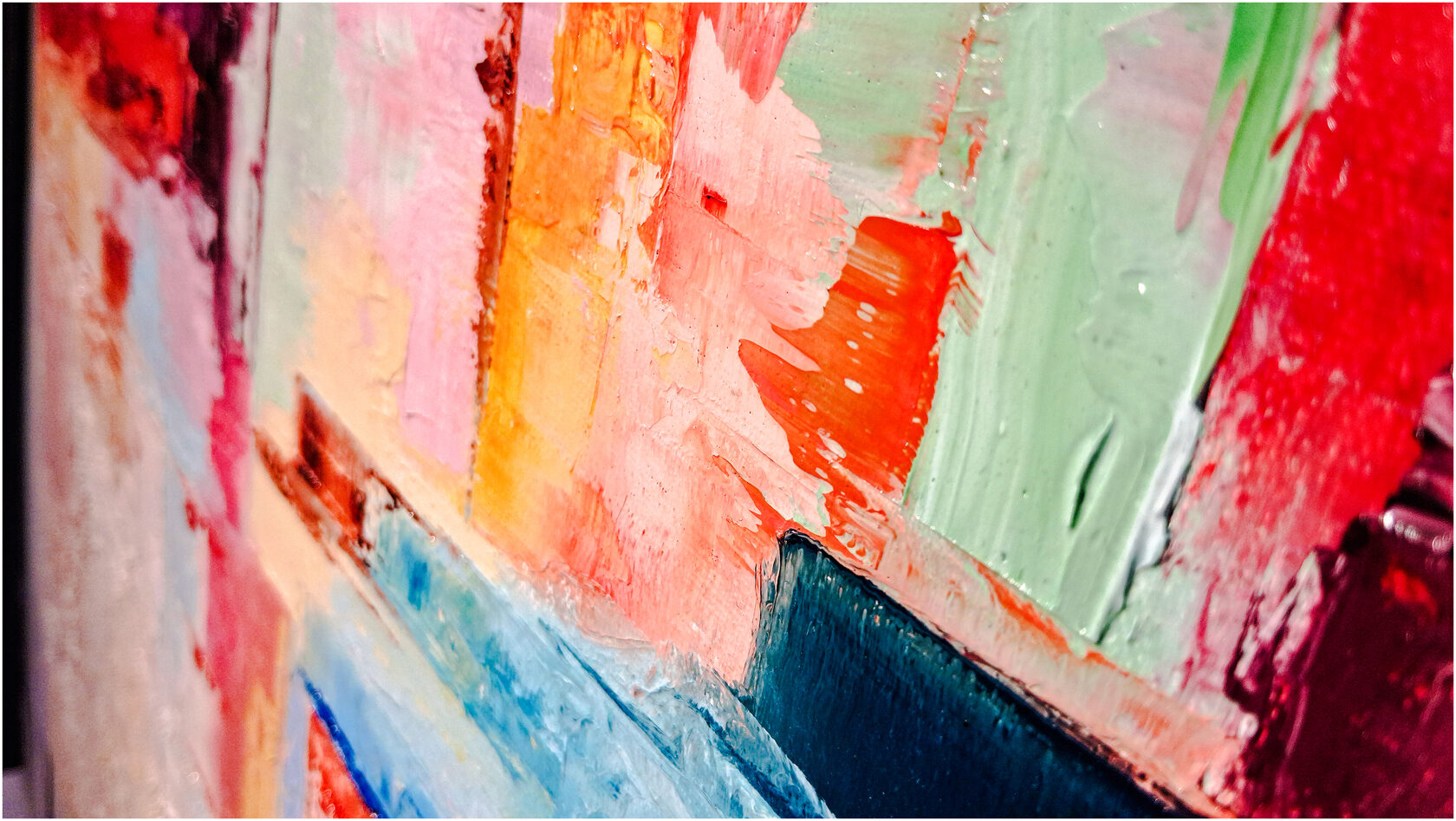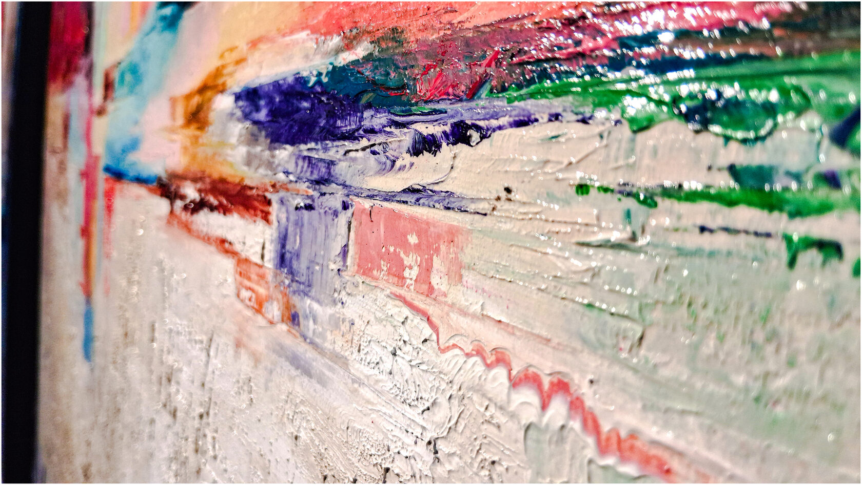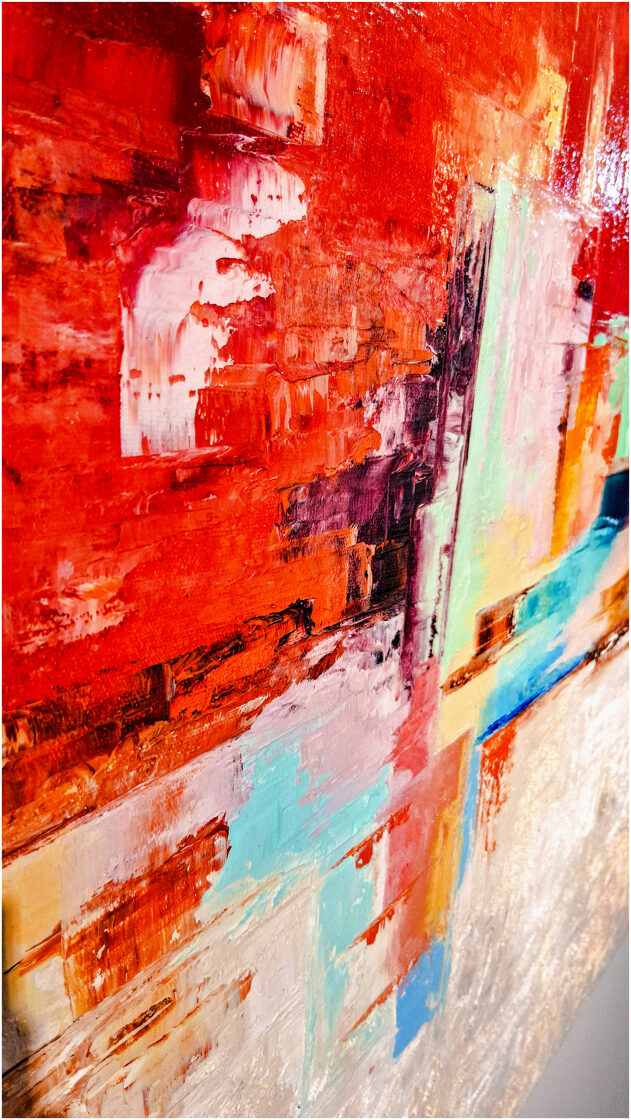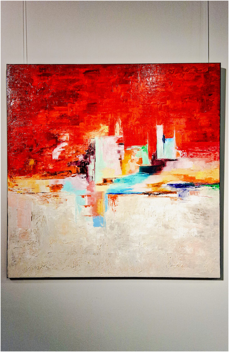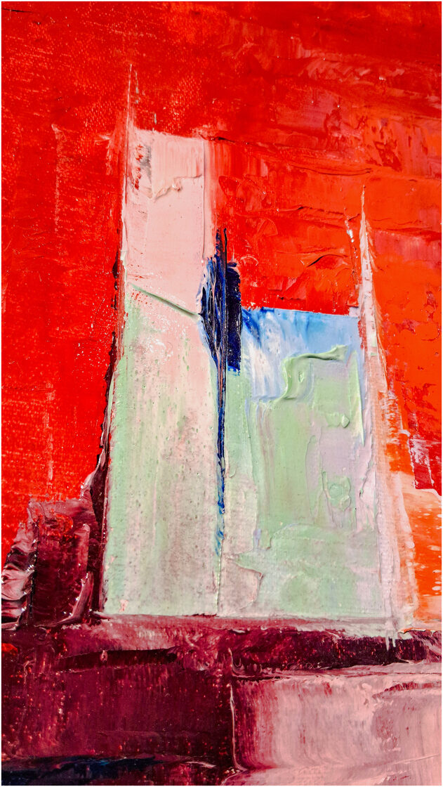 A bal oldali sötét tömbök a veszély árnyékát hozzák: emlékeztetnek arra, hogy a megbocsátás soha nem egyenlő a felejtéssel. A győztes és legyőzött között húzódó határ éppoly törékeny, mint a festményen a hideg kék és az izzó vörös találkozása.