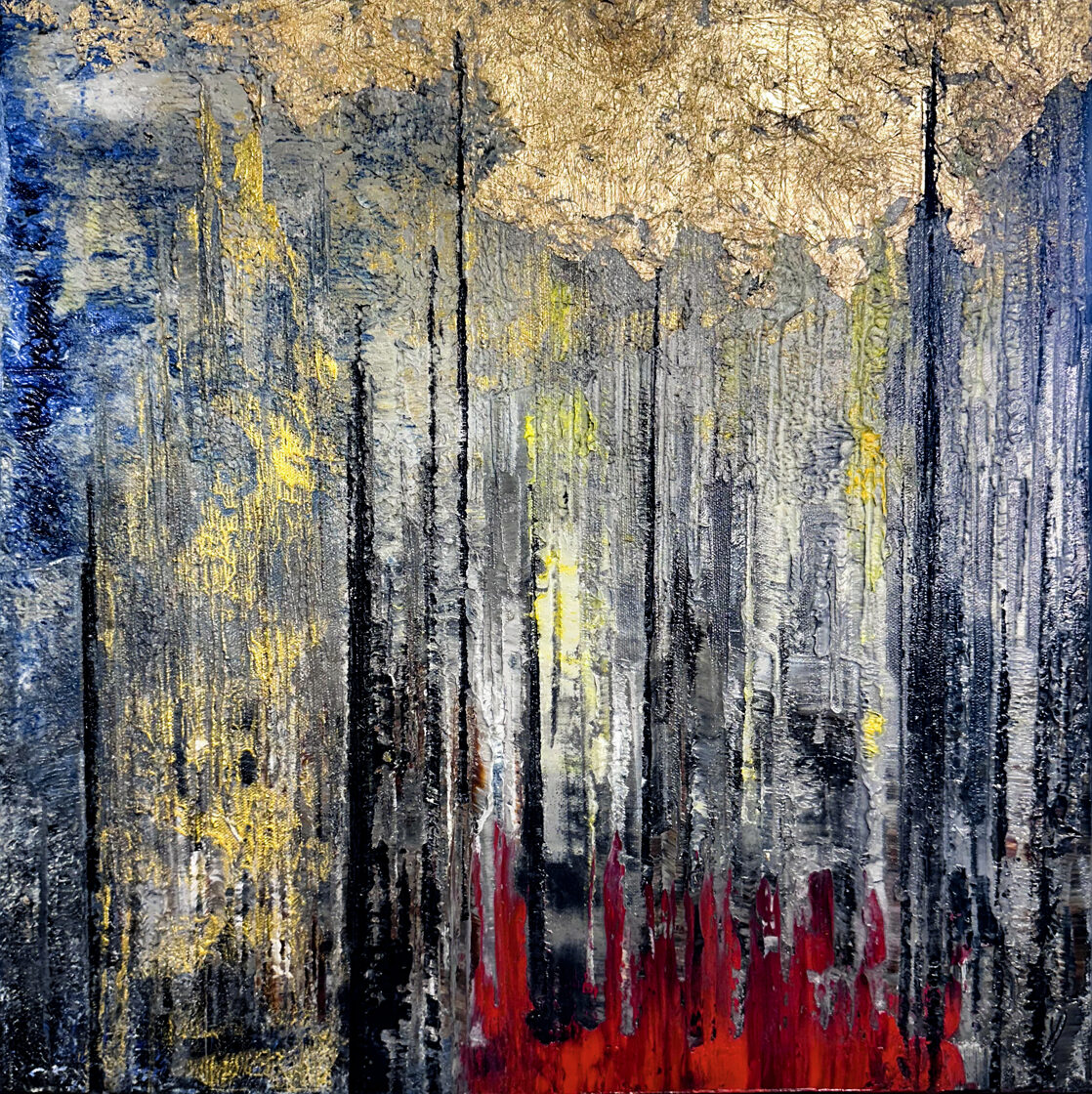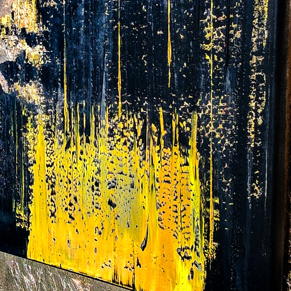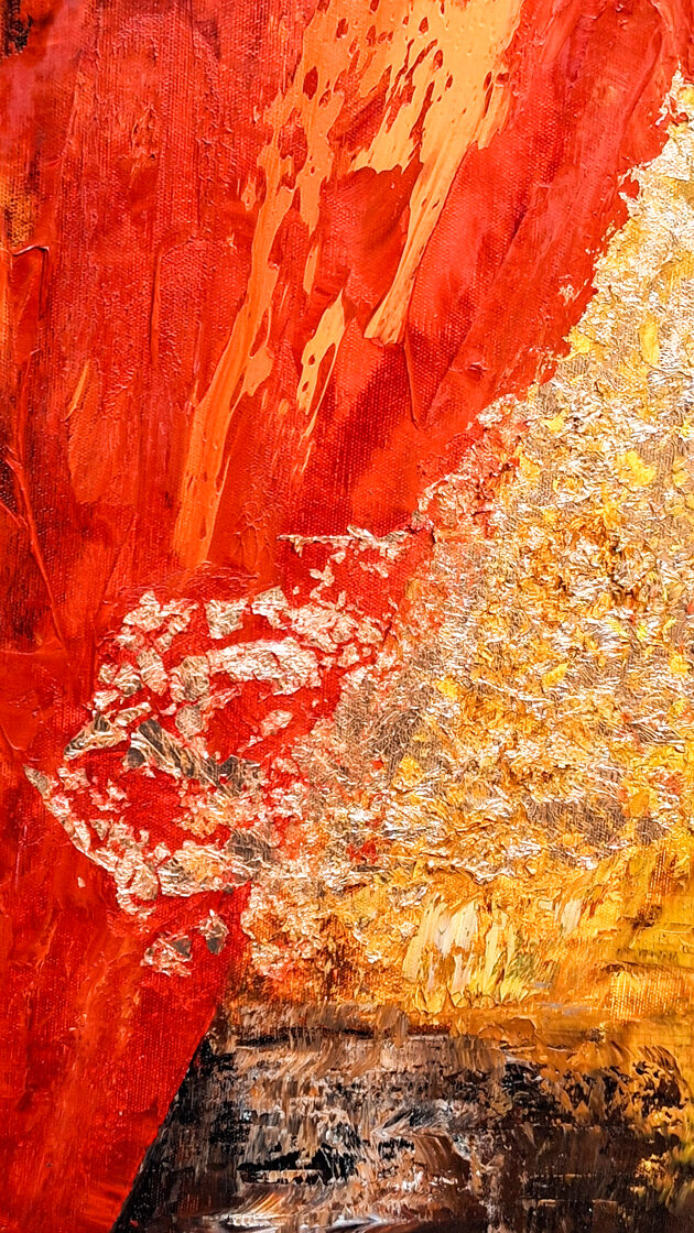A fekete, lefelé csorgó vonalak a halál közelségének élményét, a test kimerültségét, a lét bizonytalanságát hozzák közel a nézőhöz. Mintha a vászon maga is kiszáradna, porladna, mint a vándor ajka a forró homokban. És mégis: a sötét nem elnyel, hanem átvezet - kapuként szolgál, amely mögött ott ragyog a Napisten arany fénye, a cél, a beavatás ígérete.