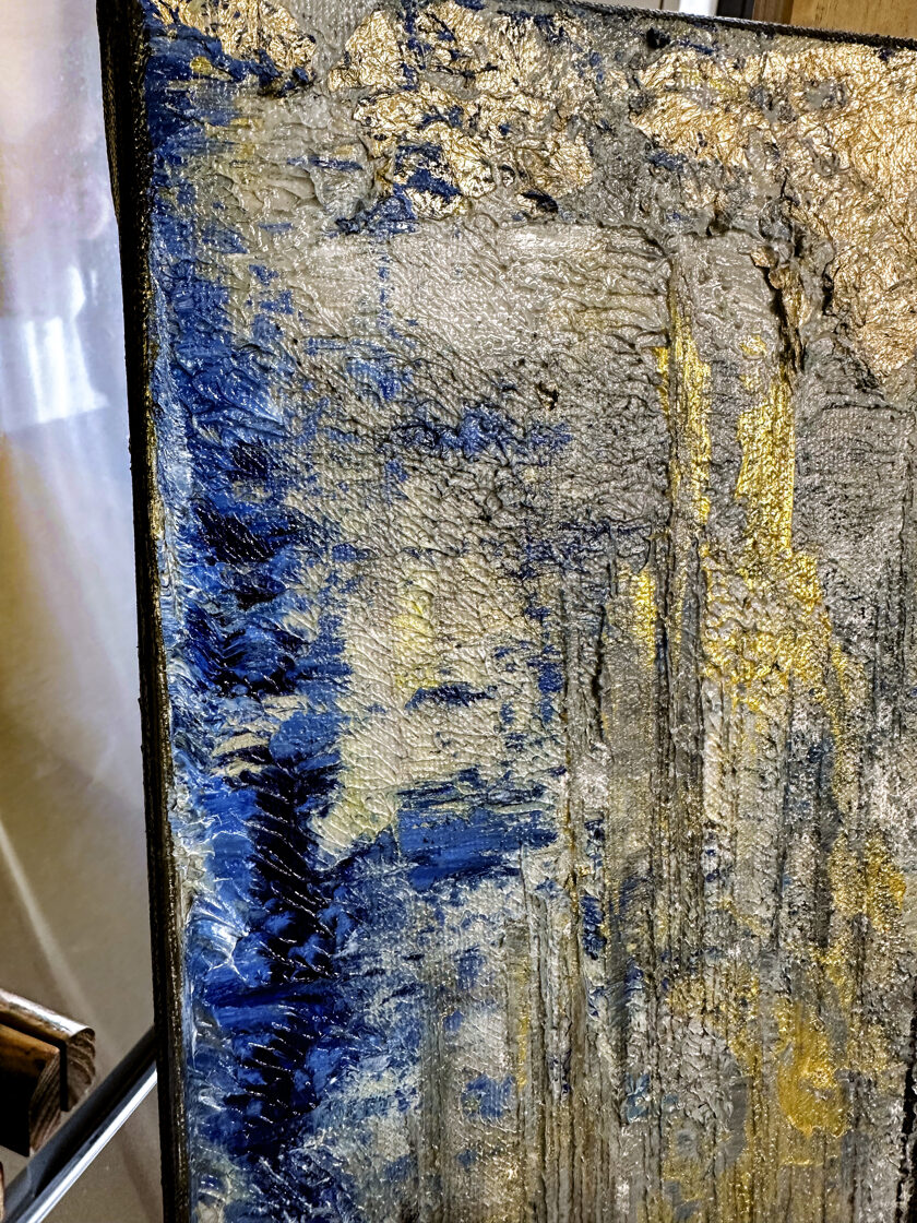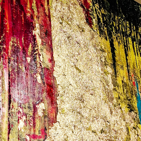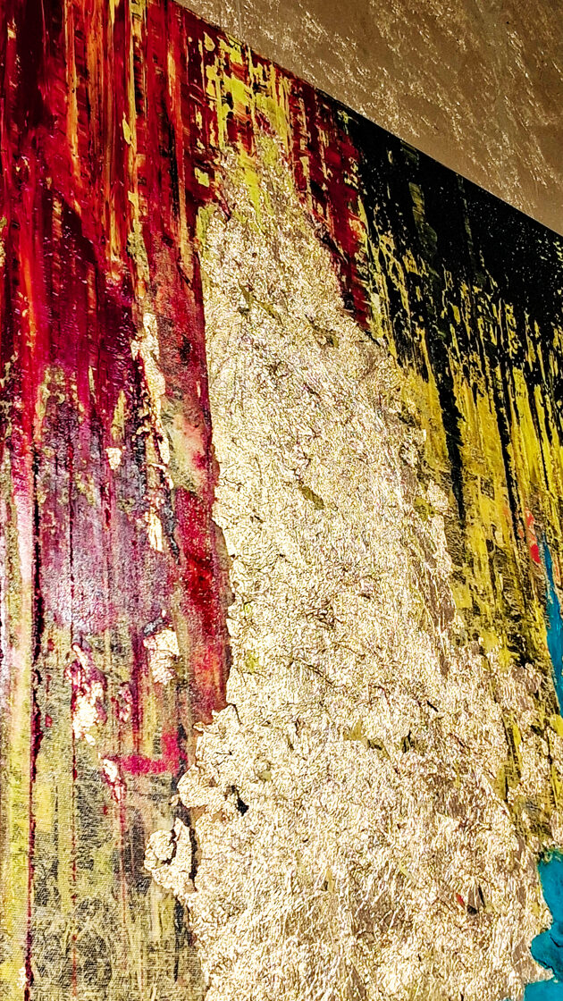 A kompozíció közepén márványszerű, érzéki finomsággal kivitelezett sáv halad át, amelyet alul és felül, mintegy keretet szabva, súlyos aranyberakás szegélyez: egy választóvonal a földi valóság és az ég által elrendelt kapcsolatok között. Az arany az isteni rend jelenlétét idézi: emlékeztetve arra, hogy még a legszemélyesebb kötelékek is a történelem nagy szövetének részei.