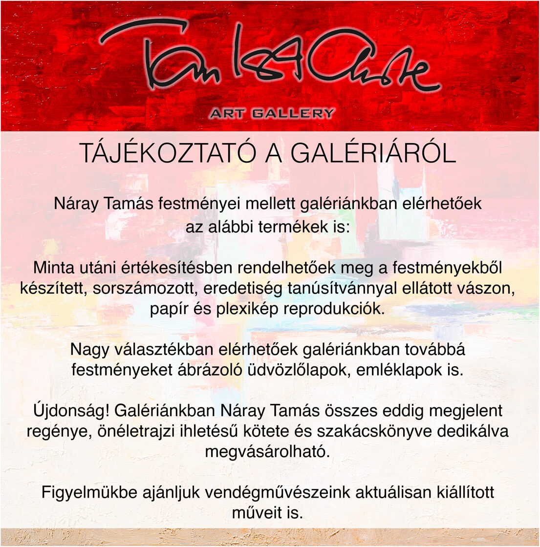 Ezúton szeretnénk tájékoztatni Önöket, hogy a megvásárolható festmények árait a művek mellett nem tüntettük fel, kivéve a művészi nyomatokat (papír-, vászonnyomat, plexikép). Vásárlási szándék esetén a mű leírása alatti "ÁR KÉRÉSE" gombra kattintva e-mailben kérhetnek az árról, szállítási feltételekről információt.