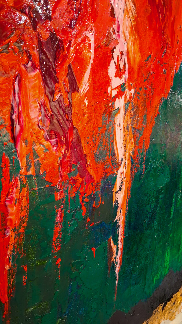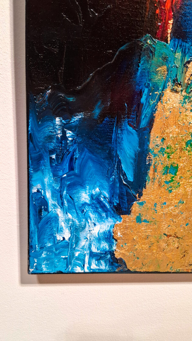 Between the reds and blacks, turquoise spots cut through, like celestial lights flashing into a wound: they symbolize both the brief flare of hope and the merciless turns of fate, but are also connected to the spiritual and emotional presence of Hephaestion. The cold lights evoke not only rational thinking and the companionship of a general, but also the timeless purity of the intimate bonds between men.