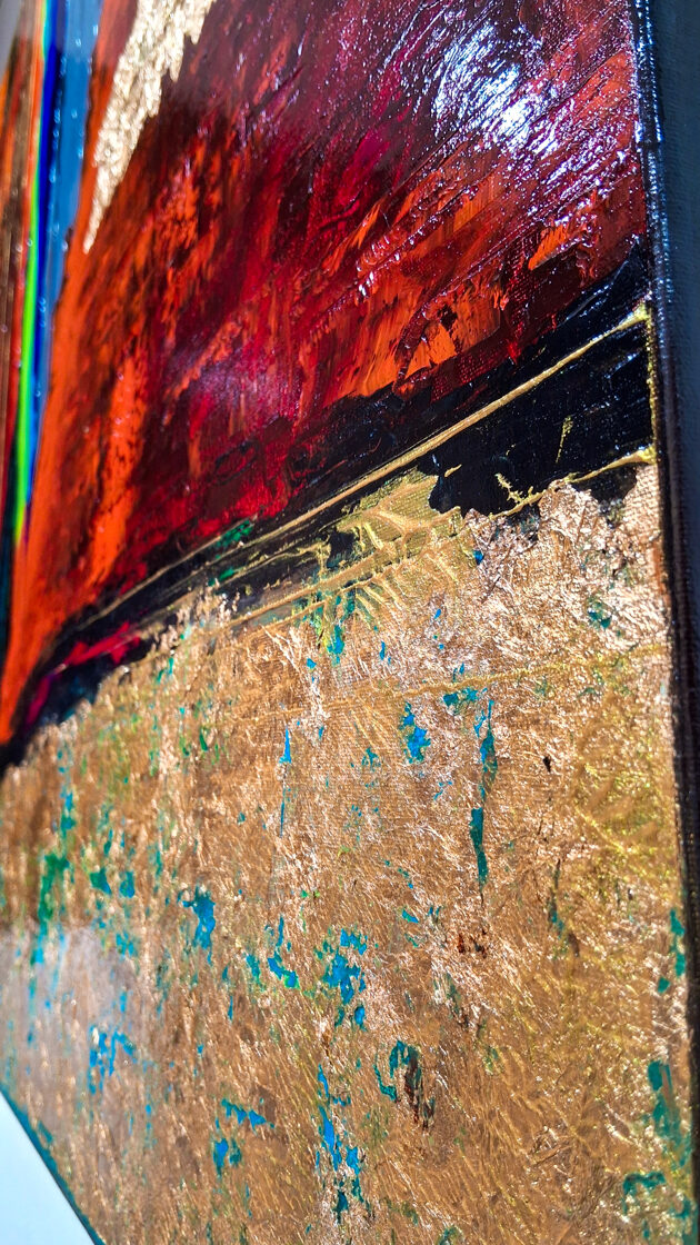 The fiery reds of the canvas evoke the heat of battle, the fierce struggle soaked with blood and sweat. The golden streams emerging from the blazing colors open up another dimension: the flow of divine energies that guided Alexander's decision. Porus appears as a gray, rocky mass: immovable, proud, his strength not collapsing even with defeat.