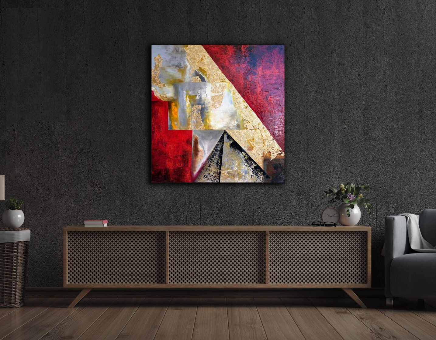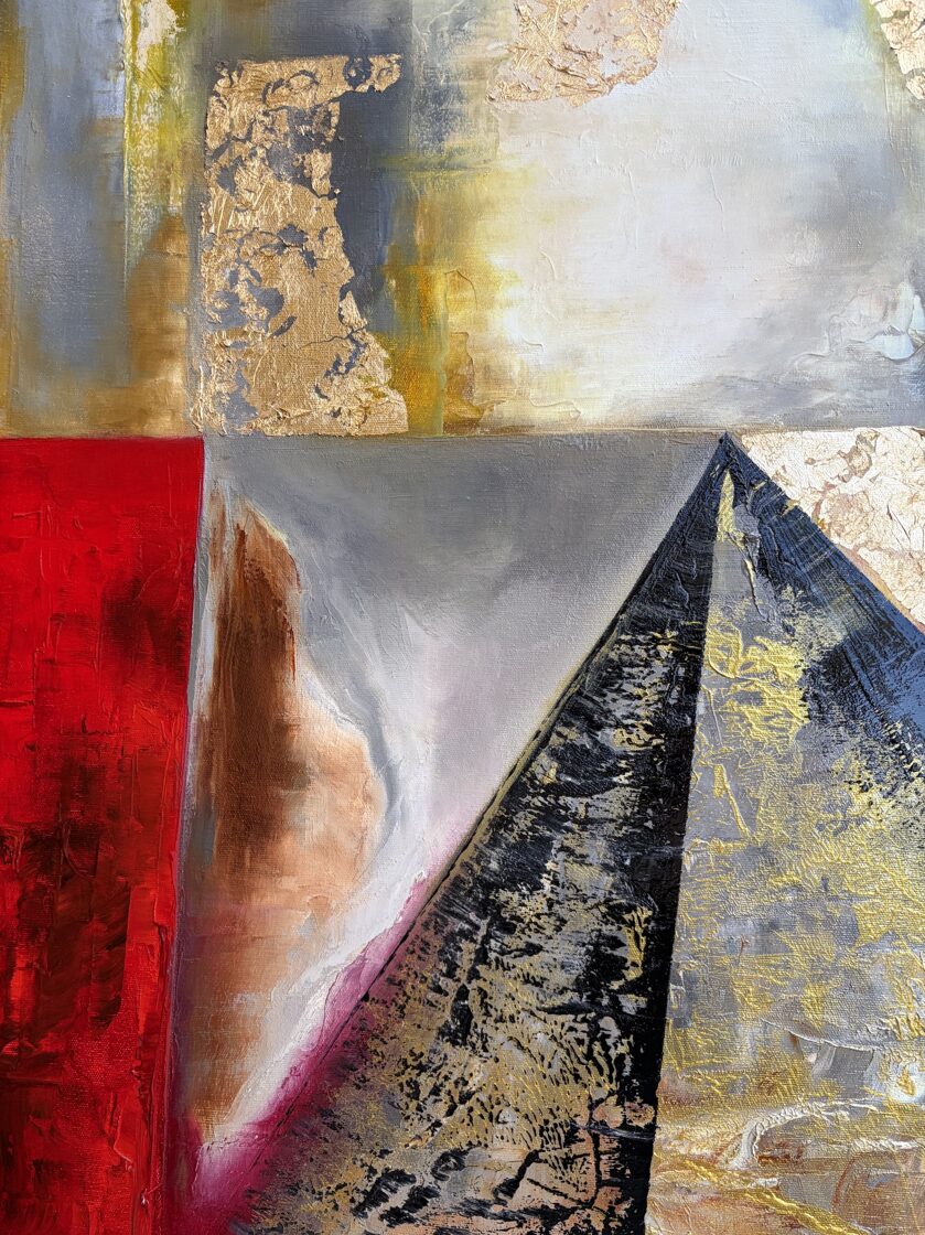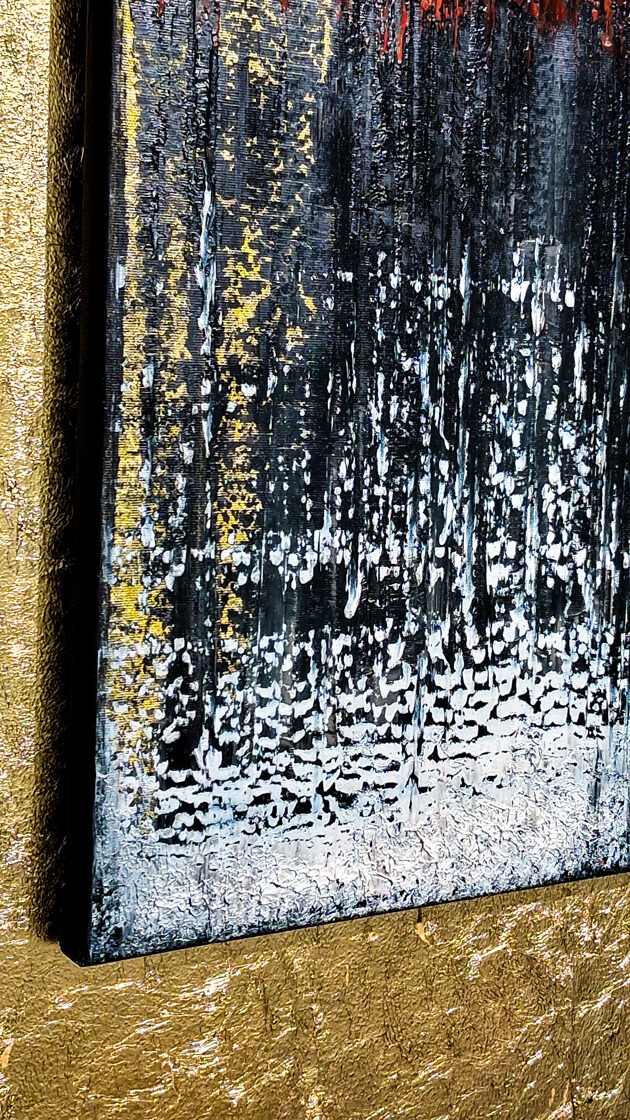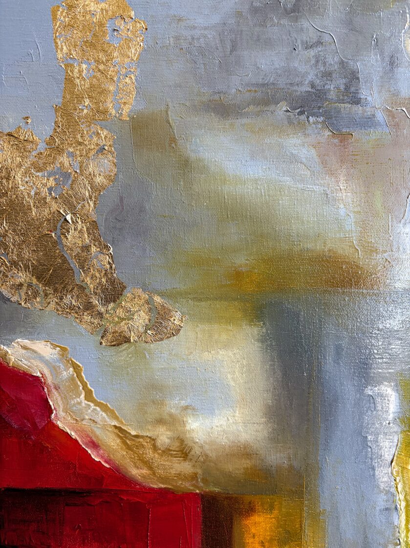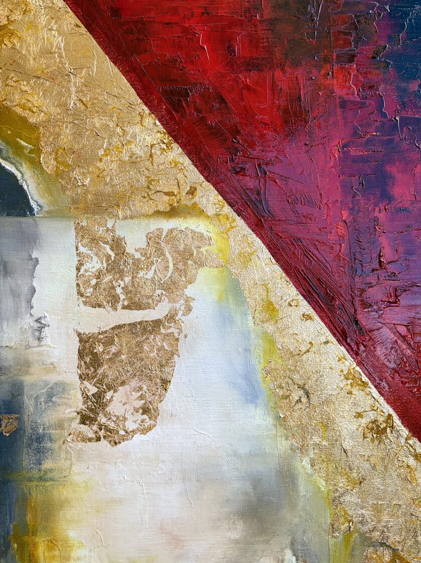 In the center of the composition, a marble-like, sensually crafted band runs through, bordered above and below with heavy gold inlay, as if framing it: a dividing line between earthly reality and relationships ordained by the heavens. The gold evokes the presence of divine order: reminding us that even the most personal bonds are part of the great fabric of history.