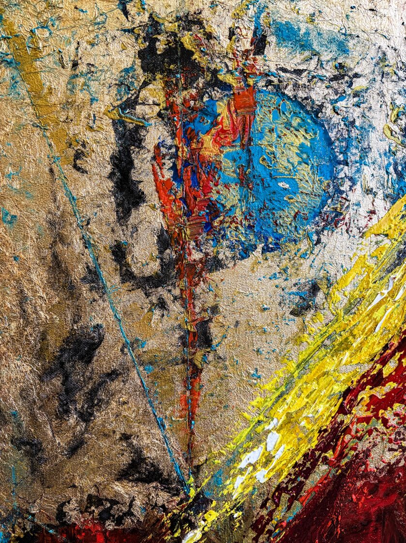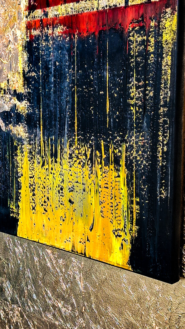 The black, downward-flowing lines bring the experience of the proximity of death, the exhaustion of the body, the uncertainty of existence closer to the viewer. As if the canvas itself were drying out, crumbling, like the lips of a wanderer in the hot sand. And yet: the darkness does not engulf, but leads through – it serves as a gate, behind which shines the golden light of the Sun God, the goal, the promise of initiation.