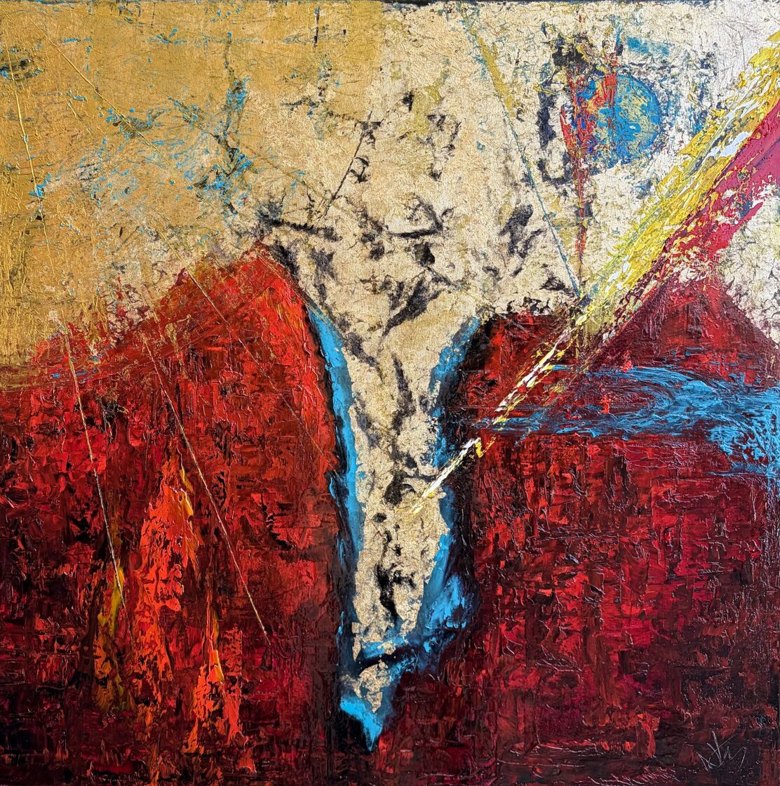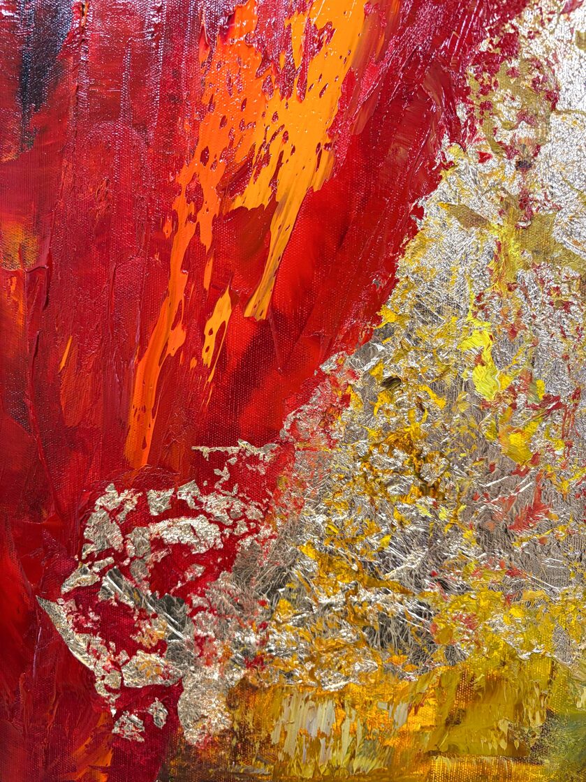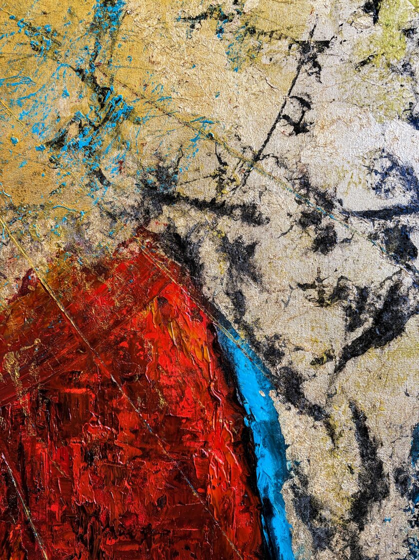 Between the reds and blacks, turquoise spots cut through, like celestial lights flashing into a wound: they symbolize both the brief flare of hope and the merciless turns of fate, but are also connected to the spiritual and emotional presence of Hephaestion. The cold lights evoke not only rational thinking and the companionship of a general, but also the timeless purity of the intimate bonds between men.
