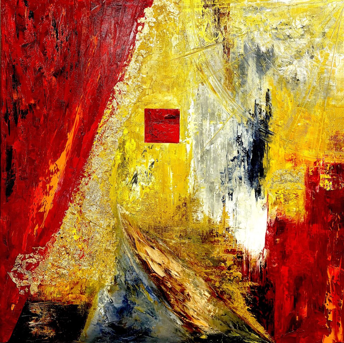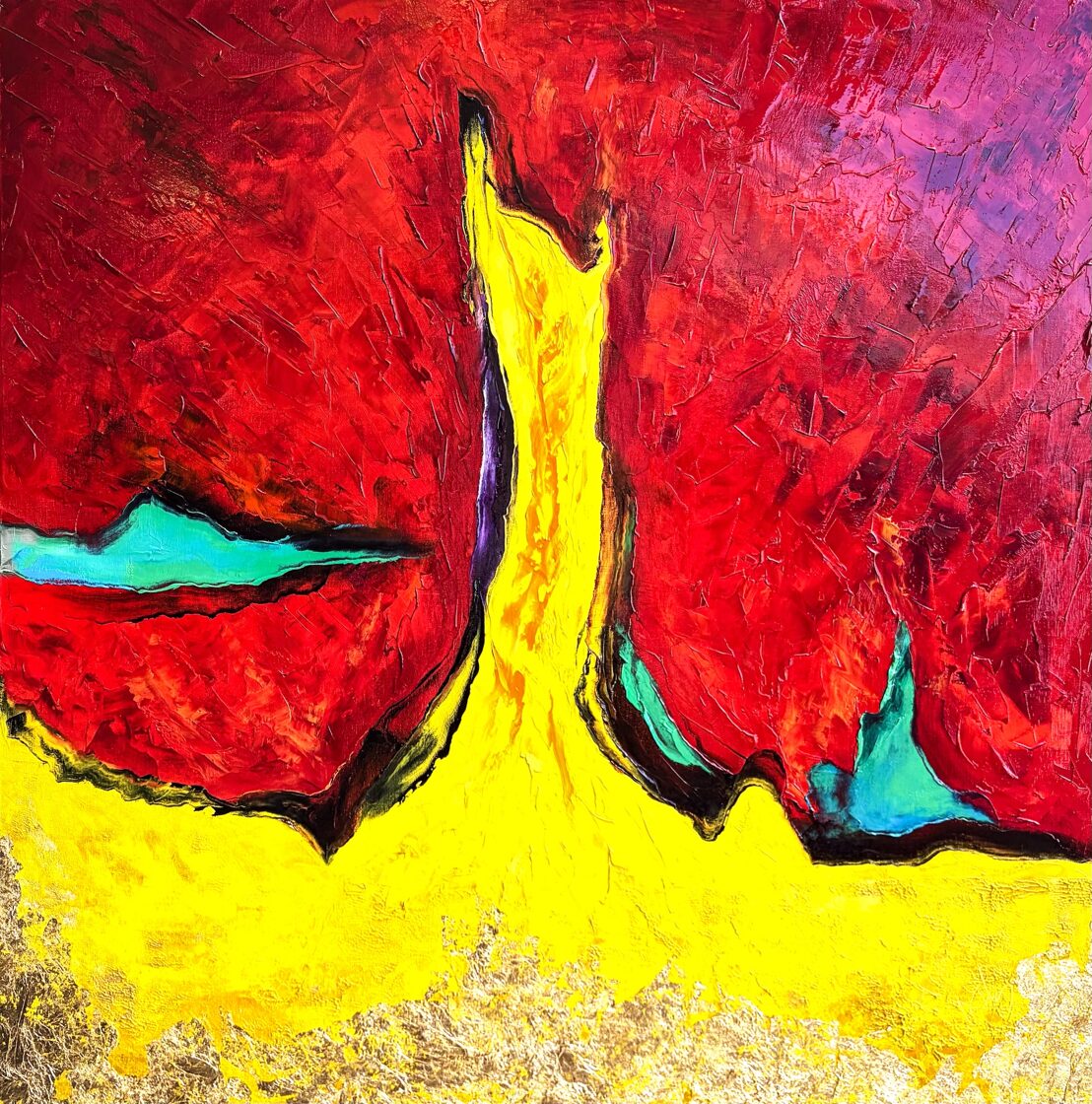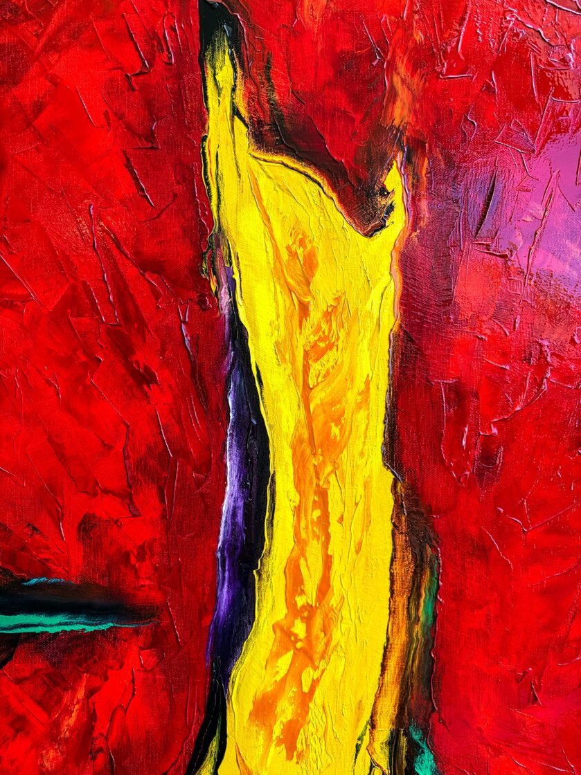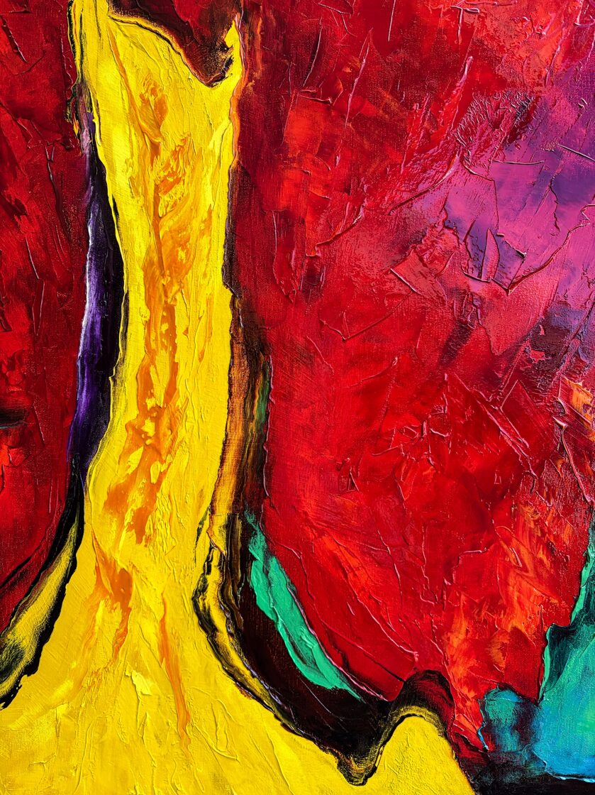 When the deposition of Romulus Augustulus occurred, the glorious Western Roman Empire came to an end, whose invincibility was acknowledged by all other rulers. The wide yellow stream of paint, arching and rising high, dividing the picture field in two, appears as the unchangeable and eternally radiant path to power. The black bands framing this on both sides simultaneously show the isolation of those striving for power and their devoted protection from external influences. However, detachment from the world does not promise much good. The crimson and midnight blue swirling surfaces dominating the composition, almost emerging from the picture field, threaten the glittering but false path to power, loudly asking the question: Who owns the Throne?