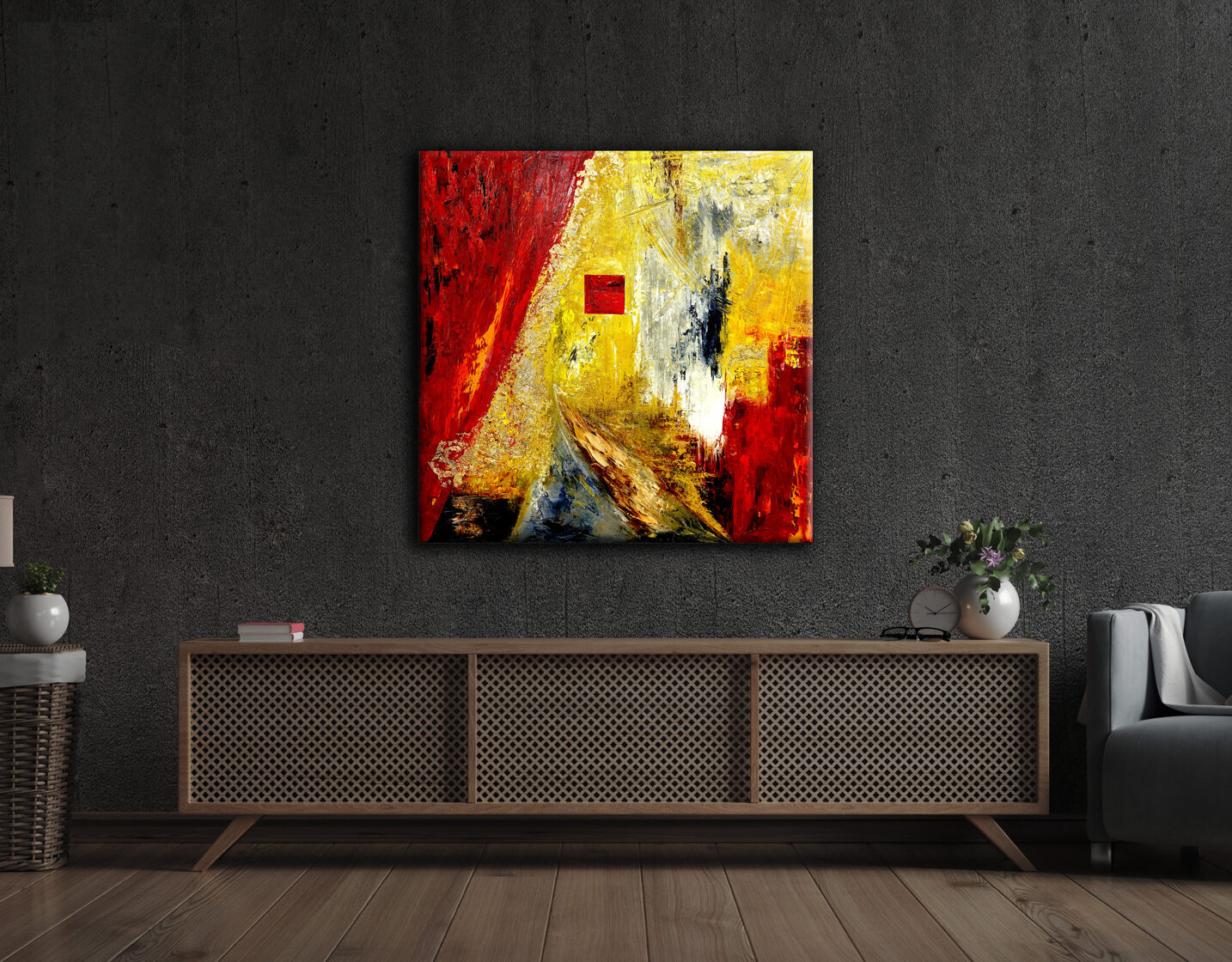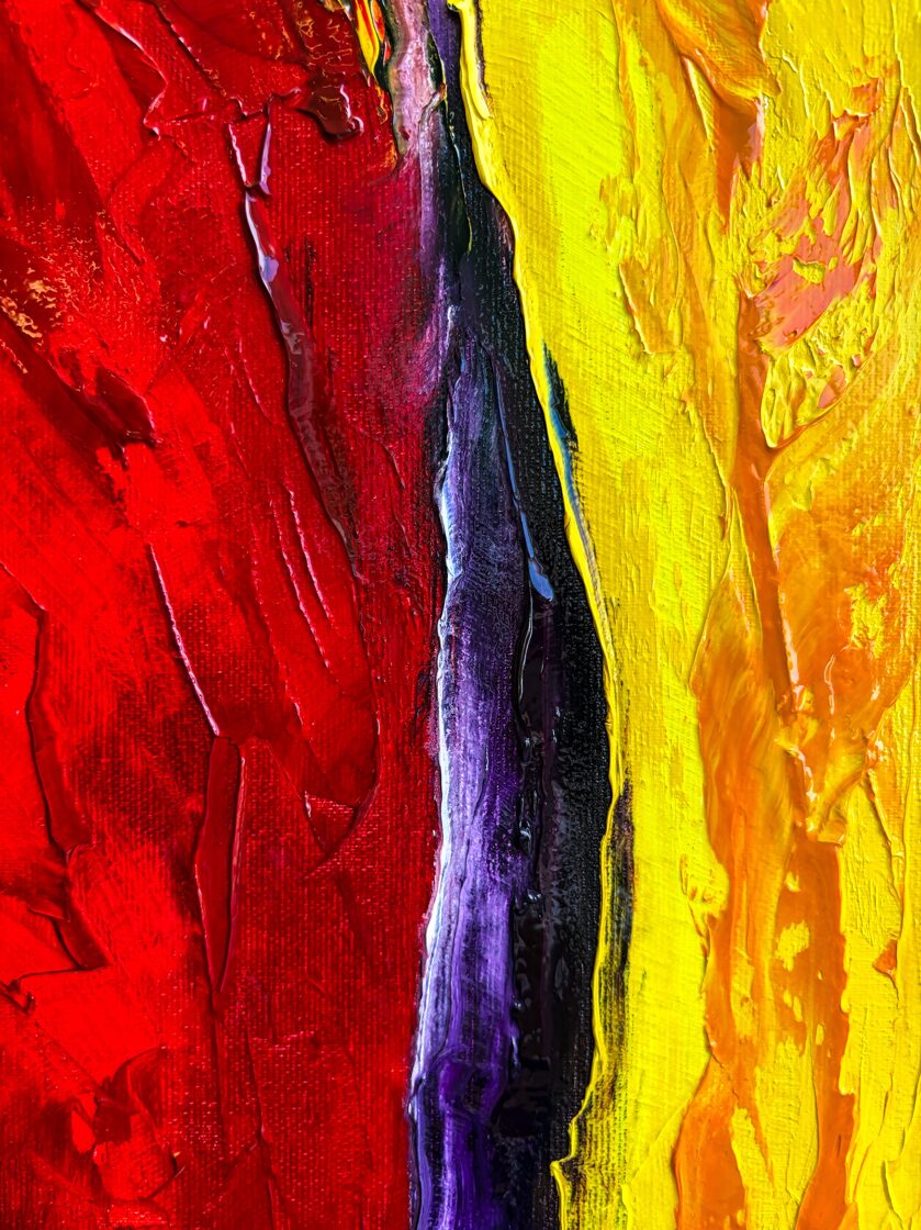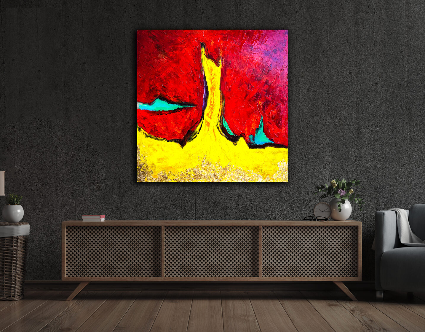 When the deposition of Romulus Augustulus occurred, the glorious Western Roman Empire came to an end, whose invincibility was acknowledged by all other rulers. The wide yellow stream of paint, arching and rising high, dividing the picture field in two, appears as the unchangeable and eternally radiant path to power. The black bands framing this on both sides simultaneously show the isolation of those striving for power and their devoted protection from external influences. However, detachment from the world does not promise much good. The crimson and midnight blue swirling surfaces dominating the composition, almost emerging from the picture field, threaten the glittering but false path to power, loudly asking the question: Who owns the Throne?