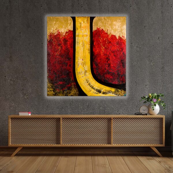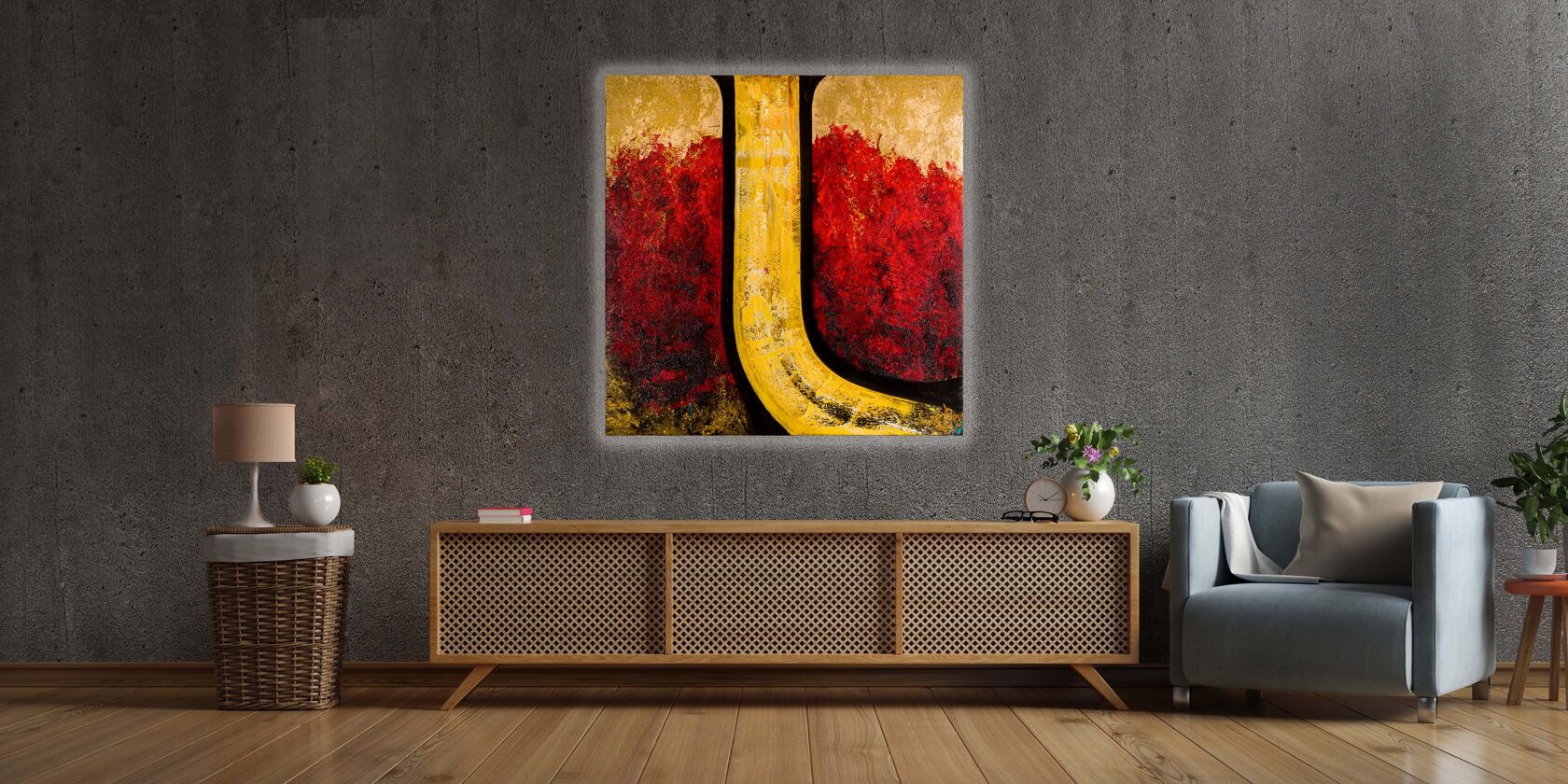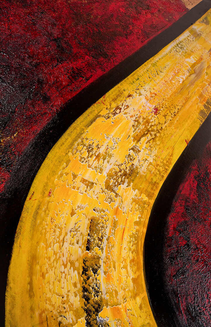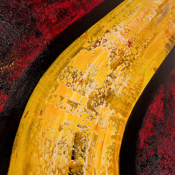 Cuando se produjo la deposición de Rómulo Augústulo, llegó a su fin el glorioso Imperio romano de Occidente, cuya invencibilidad todos los demás gobernantes también reconocían. El amplio río de pintura amarilla, que divide el campo pictórico en dos de forma deliberada y se eleva hacia lo alto, presenta como inmutable y eternamente resplandeciente el camino hacia el poder. Las franjas negras que lo enmarcan a ambos lados muestran a la vez el aislamiento de quienes ascienden por la senda del poder y su protección comprometida frente a influencias externas. Sin embargo, separarse del mundo no augura nada bueno. Las superficies ondulantes en tonos carmesí y azul noche, que desean dominar la composición, casi emergiendo del campo pictórico, amenazan el camino del poder de brillo falso, clamando la pregunta: ¿De quién es el trono?