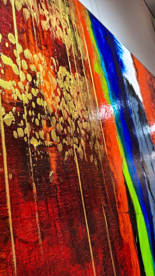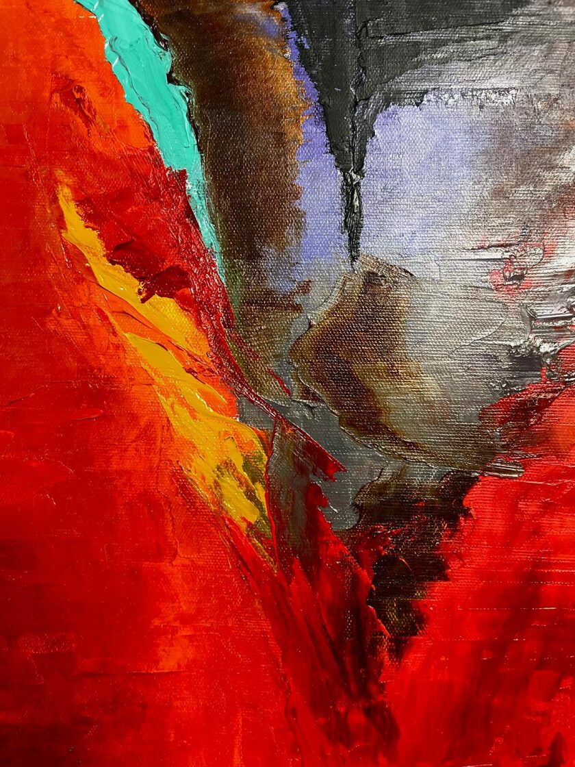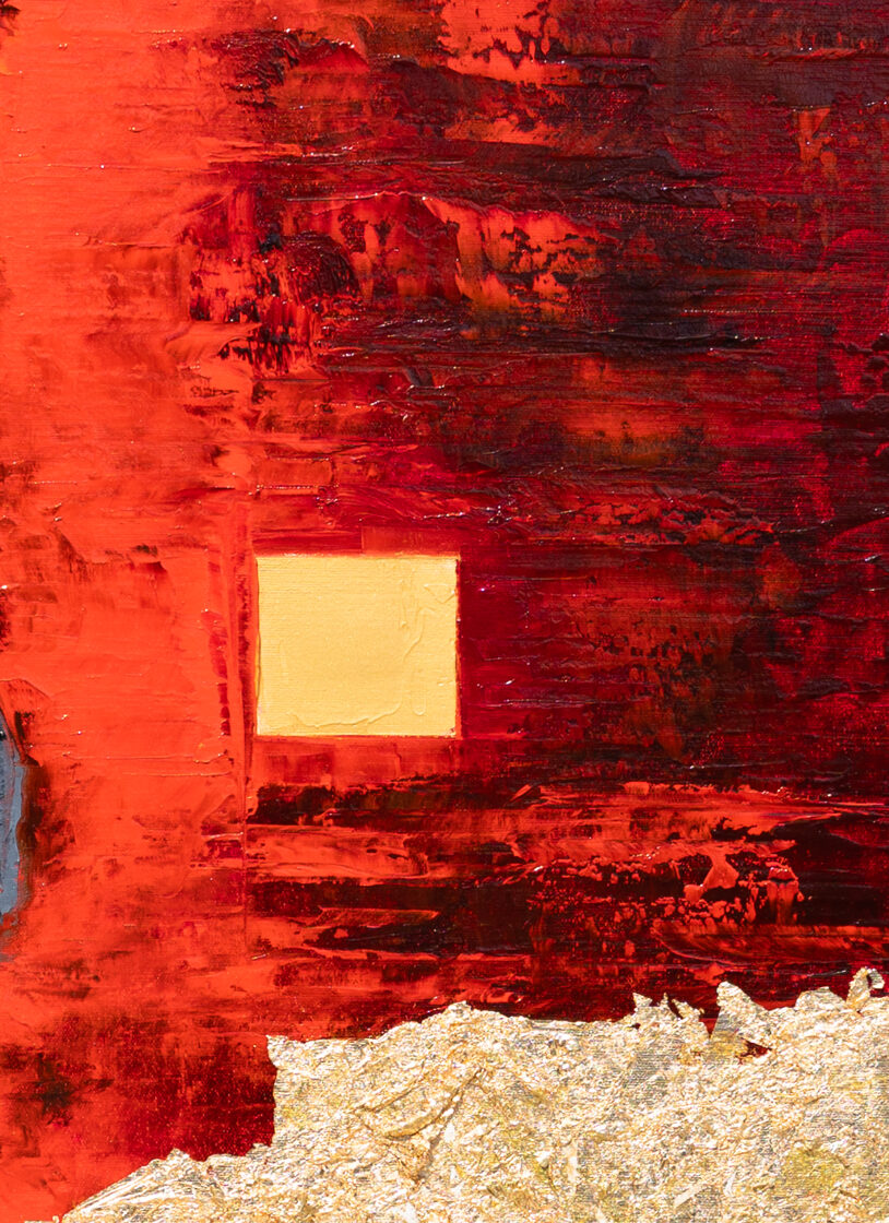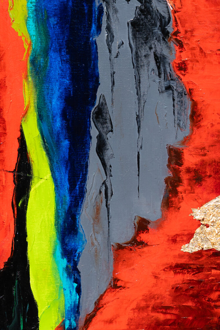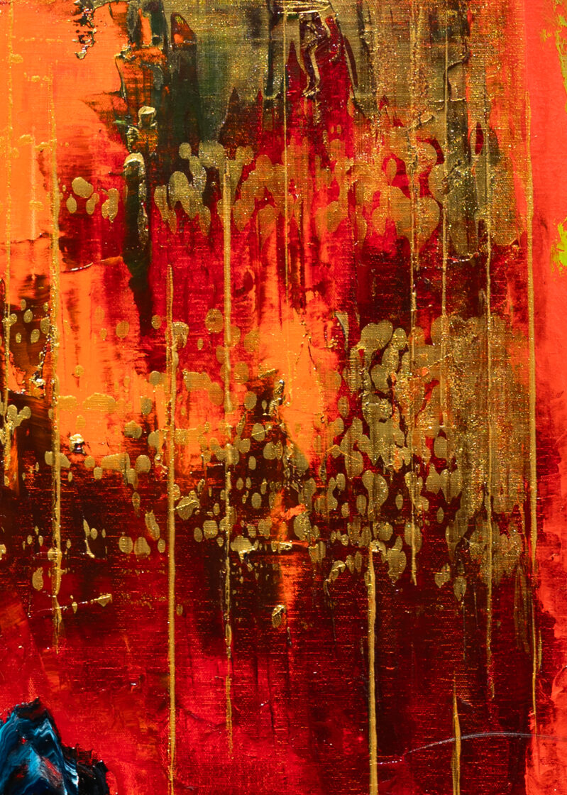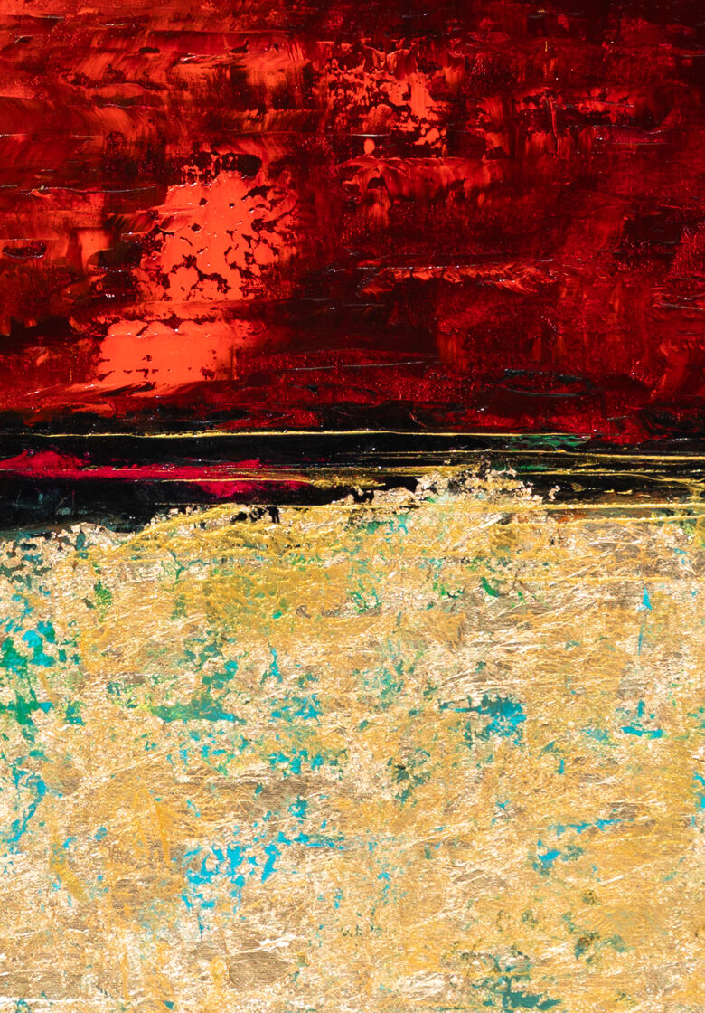 Los rojos ardientes del lienzo evocan el fragor de la batalla, la lucha feroz empapada de sangre y sudor. De los colores llameantes irrumpen corrientes doradas que ya abren otra dimensión: el flujo de energías divinas que guiaron la decisión de Alejandro. Poro aparece como un bloque gris y rocoso: inamovible, orgulloso, su fuerza no se derrumbó ni siquiera con la derrota.