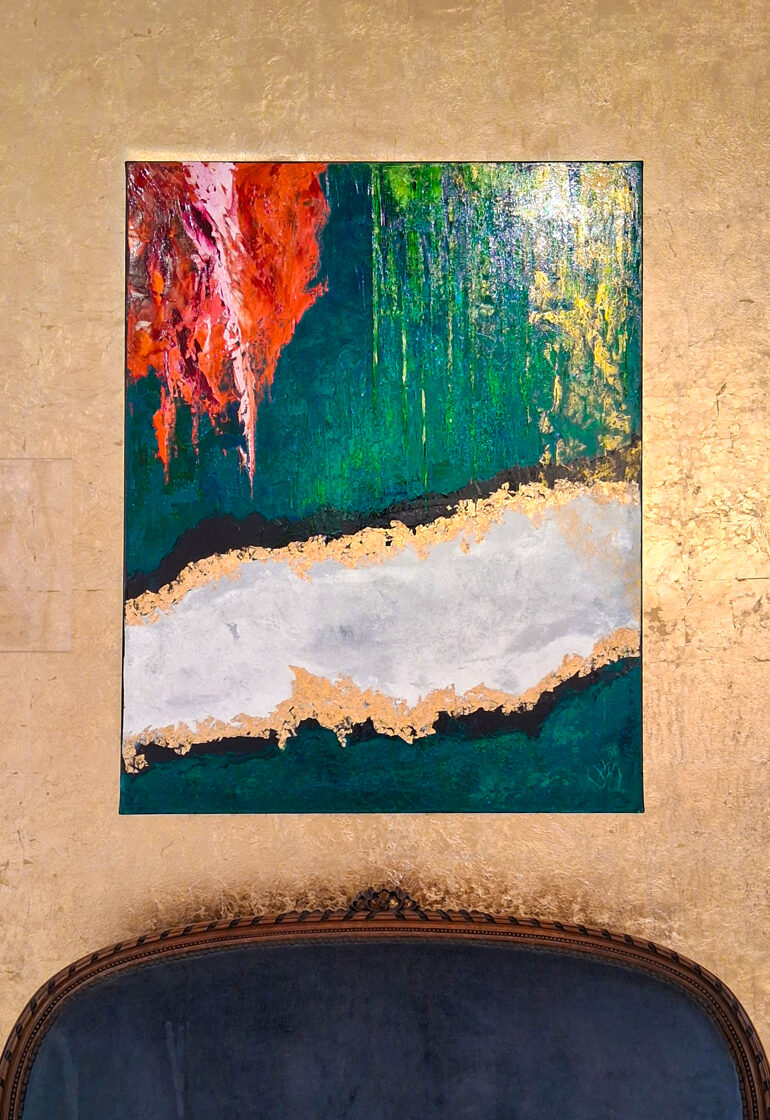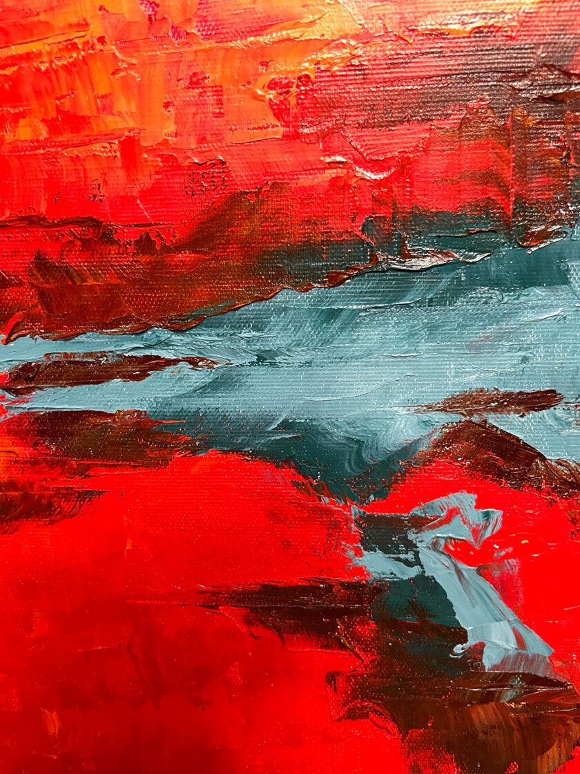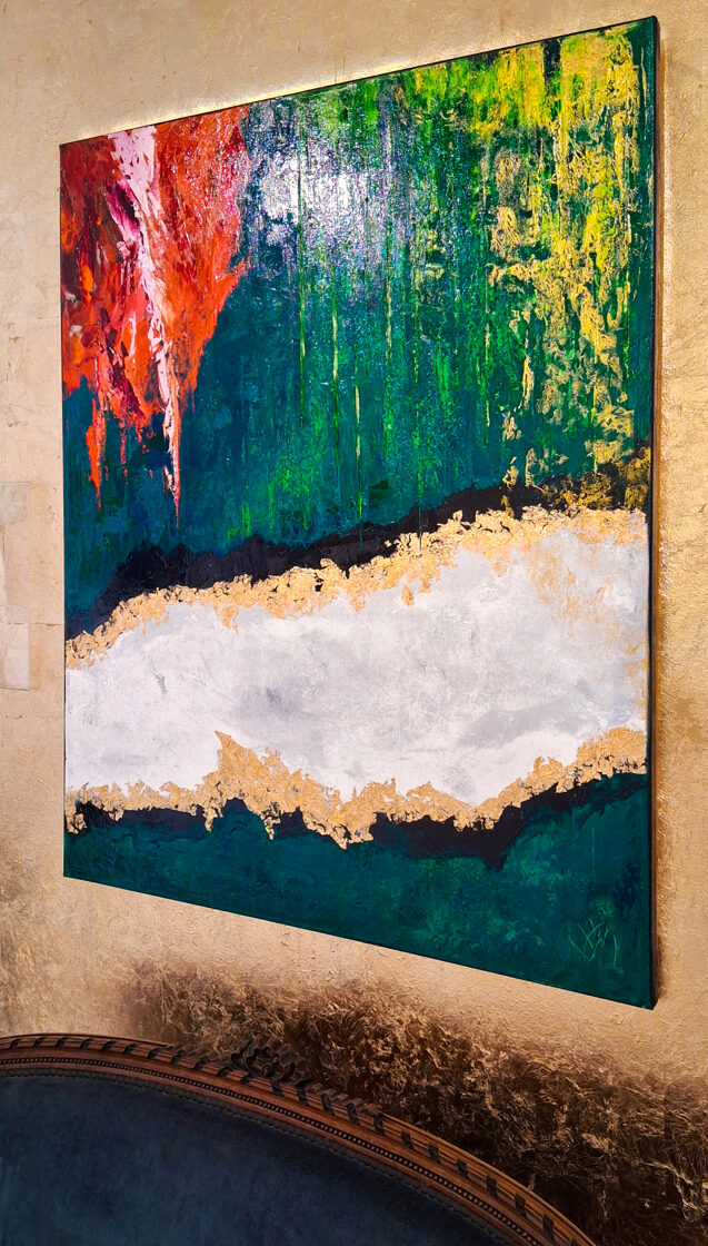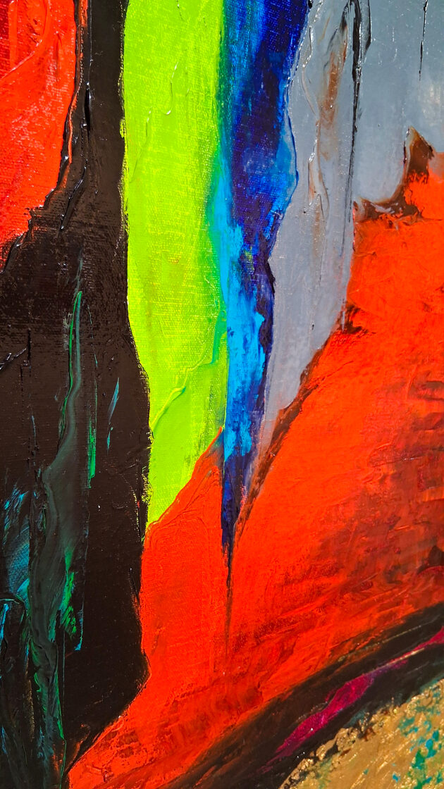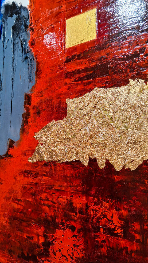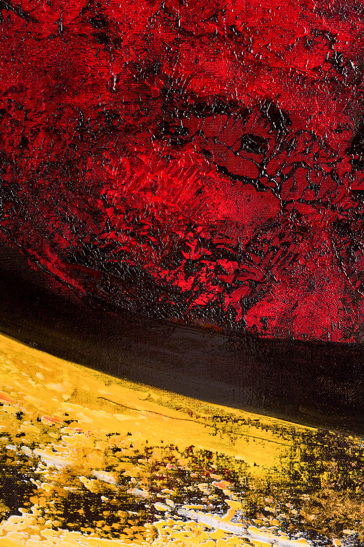 Los rojos ardientes del lienzo evocan el fragor de la batalla, la lucha feroz empapada de sangre y sudor. De los colores llameantes irrumpen corrientes doradas que ya abren otra dimensión: el flujo de energías divinas que guiaron la decisión de Alejandro. Poro aparece como un bloque gris y rocoso: inamovible, orgulloso, su fuerza no se derrumbó ni siquiera con la derrota.