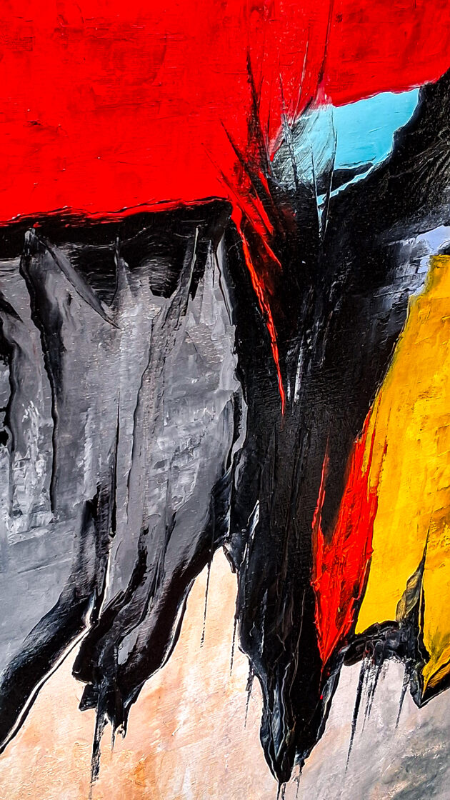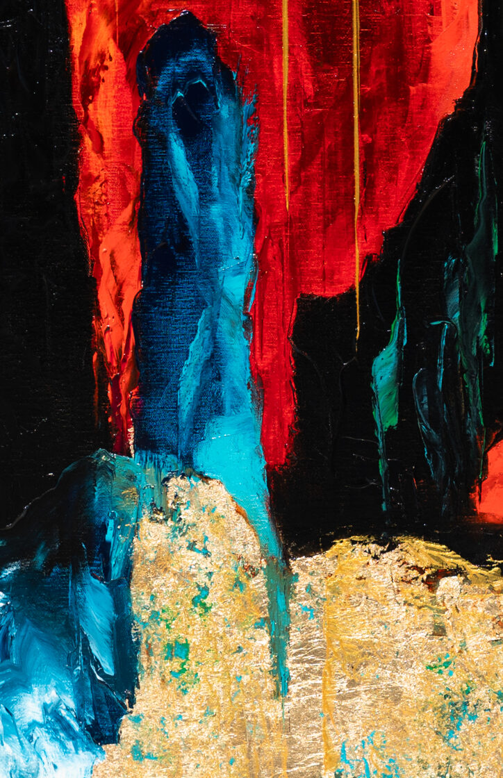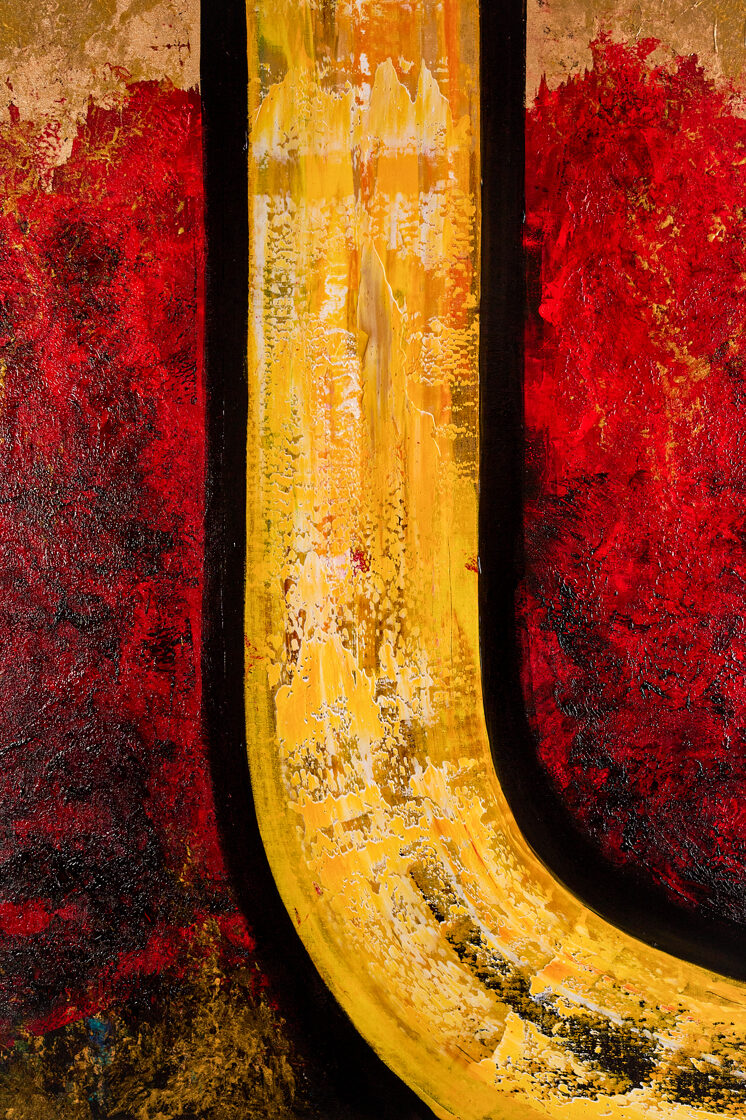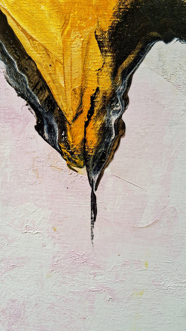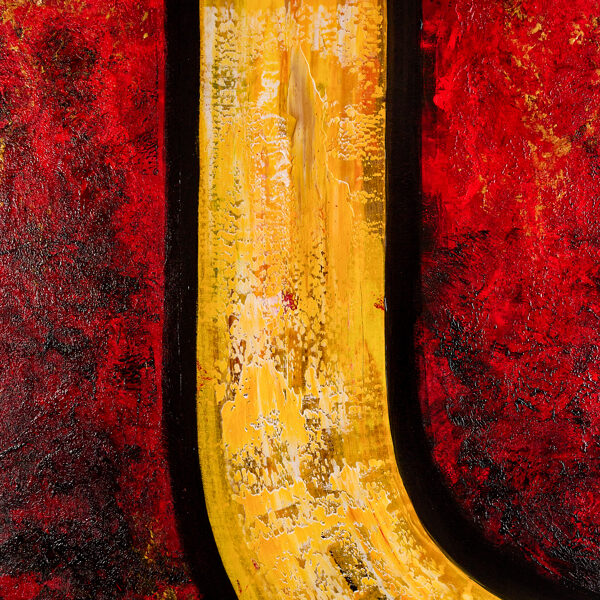 Las líneas negras que chorrean hacia abajo acercan al espectador la experiencia de la proximidad de la muerte, el agotamiento del cuerpo, la incertidumbre de la existencia. Como si el propio lienzo se secara, se desmoronara, como los labios del caminante en la arena ardiente. Y, sin embargo: la oscuridad no devora, sino que conduce a través: sirve como una puerta, detrás de la cual brilla la luz dorada del Dios Sol, la meta, la promesa de la iniciación.