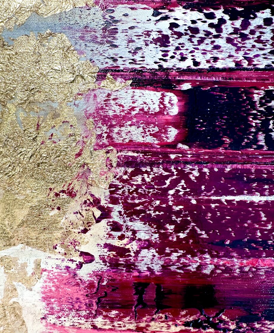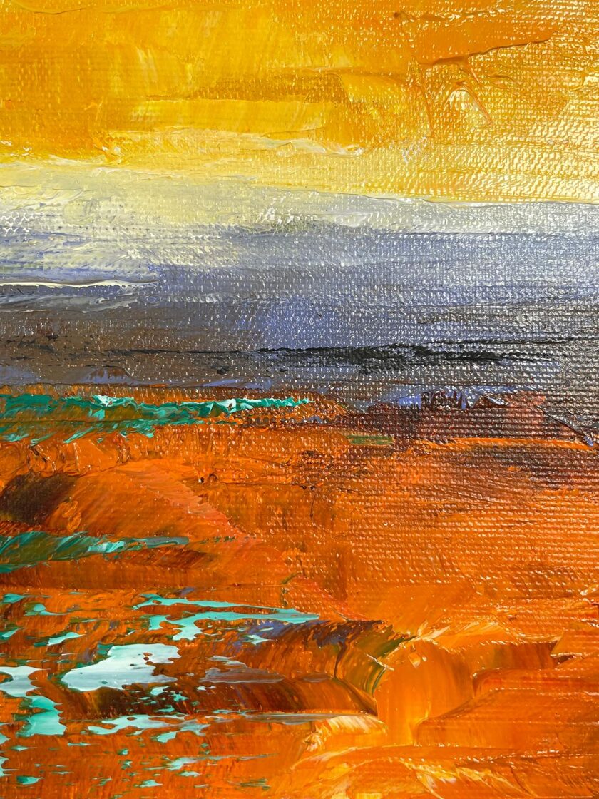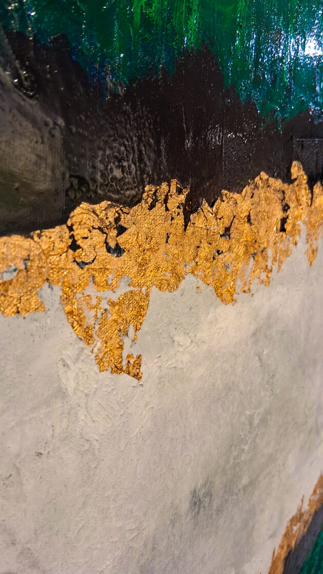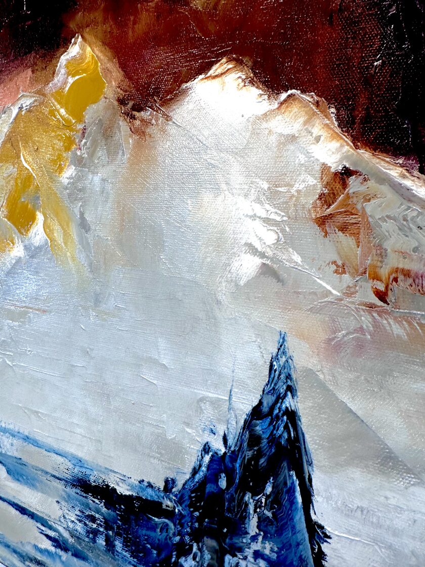 Las líneas negras que chorrean hacia abajo acercan al espectador la experiencia de la proximidad de la muerte, el agotamiento del cuerpo, la incertidumbre de la existencia. Como si el propio lienzo se secara, se desmoronara, como los labios del caminante en la arena ardiente. Y, sin embargo: la oscuridad no devora, sino que conduce a través: sirve como una puerta, detrás de la cual brilla la luz dorada del Dios Sol, la meta, la promesa de la iniciación.