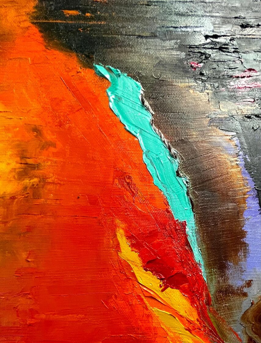 Entre los rojos y los negros irrumpen manchas turquesas, como luces celestes que destellan en una herida: simbolizan a la vez el breve brote de esperanza y los implacables cambios de rumbo del destino, pero también se vinculan a la presencia espiritual y anímica de Hefestión. Las luces frías no solo evocan el pensamiento racional y la camaradería militar, sino también la pureza intemporal del vínculo íntimo entre hombres.