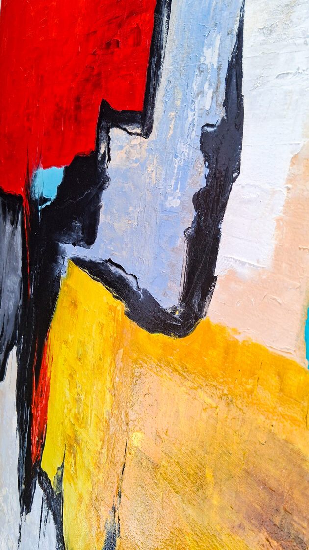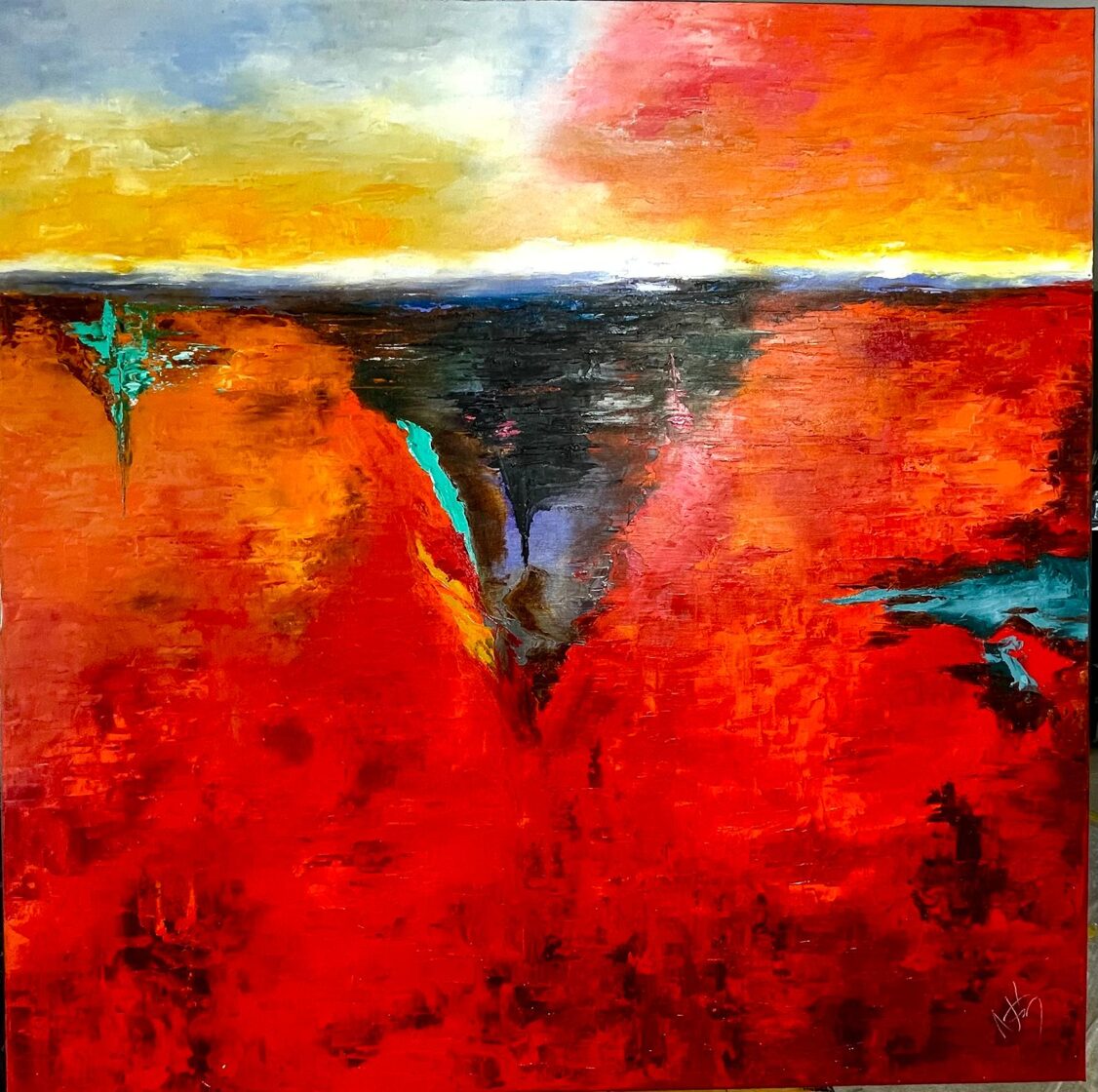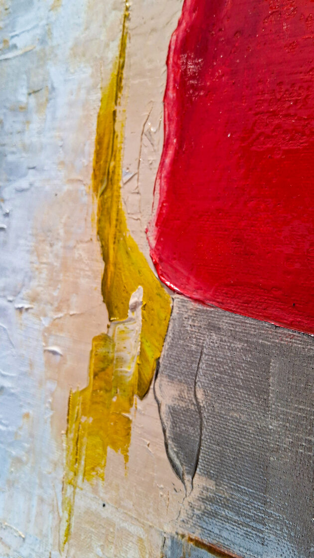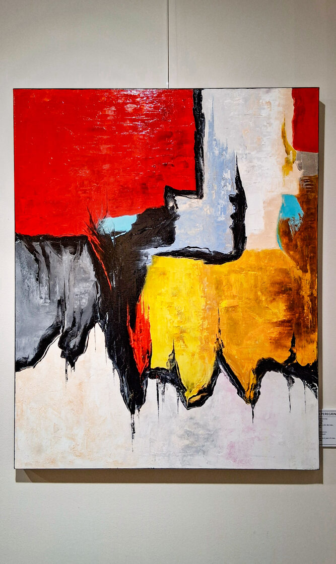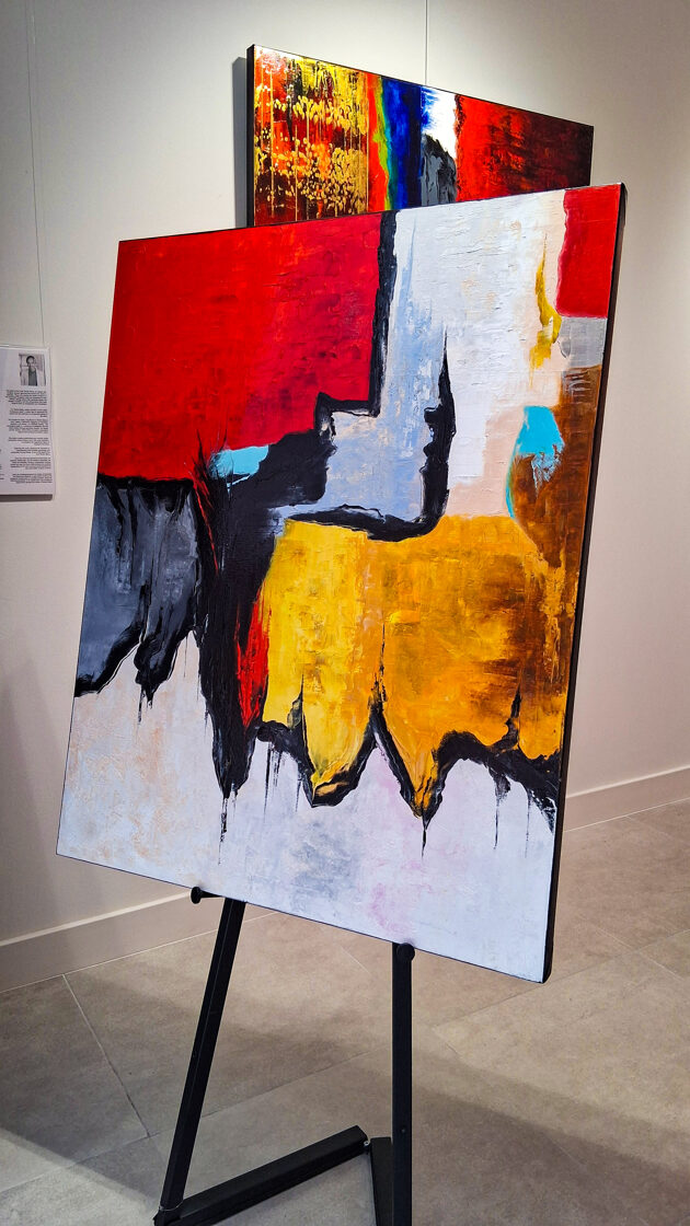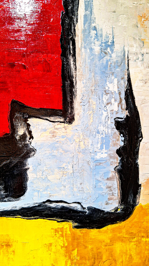 El camino de Aleksandros hacia el oasis de Siwa no es simplemente un desplazamiento geográfico, sino un cruce sagrado: el paso de un destino humano hacia el orden divino. A primera vista, las superficies fragmentadas e inquietas del cuadro hablan de esta transición: el rojo, del ardor de las luchas y del tormento del cuerpo; el amarillo, de la promesa de la luz divina; mientras que la base blanquecina, semejante a roca, evoca el rostro intemporal del desierto eterno y sólido.