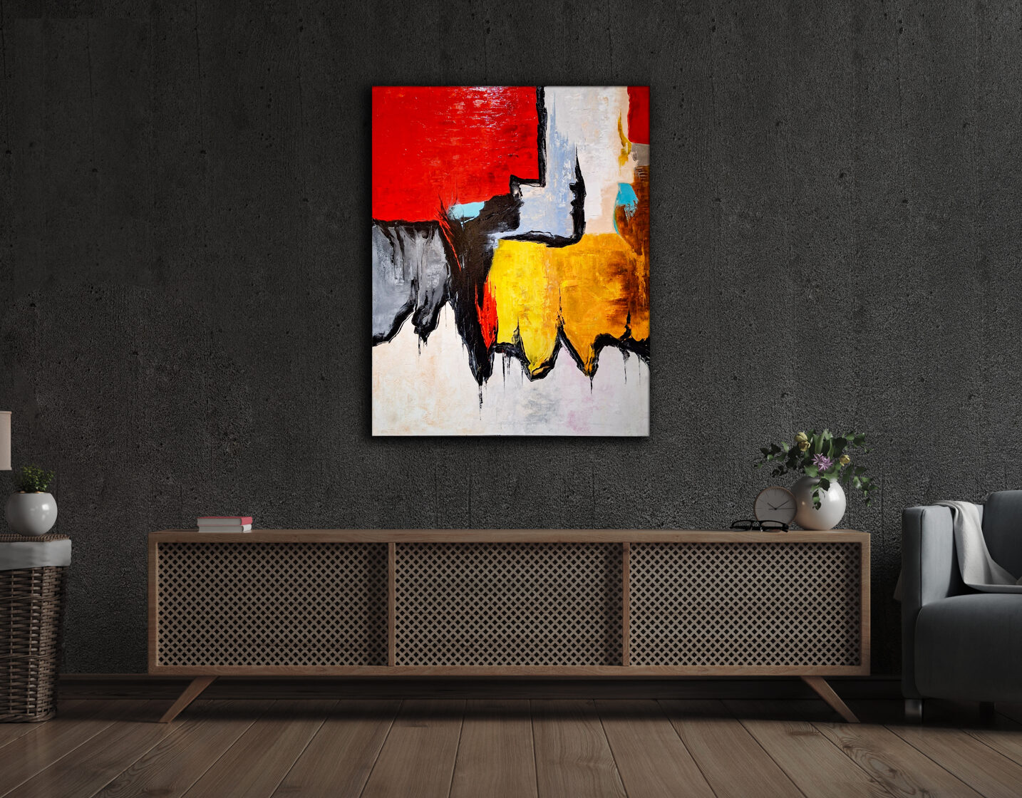 Cuando se produjo la deposición de Rómulo Augústulo, llegó a su fin el glorioso Imperio romano de Occidente, cuya invencibilidad todos los demás gobernantes también reconocían. El amplio río de pintura amarilla, que divide el campo pictórico en dos de forma deliberada y se eleva hacia lo alto, presenta como inmutable y eternamente resplandeciente el camino hacia el poder. Las franjas negras que lo enmarcan a ambos lados muestran a la vez el aislamiento de quienes ascienden por la senda del poder y su protección comprometida frente a influencias externas. Sin embargo, separarse del mundo no augura nada bueno. Las superficies ondulantes en tonos carmesí y azul noche, que desean dominar la composición, casi emergiendo del campo pictórico, amenazan el camino del poder de brillo falso, clamando la pregunta: ¿De quién es el trono?