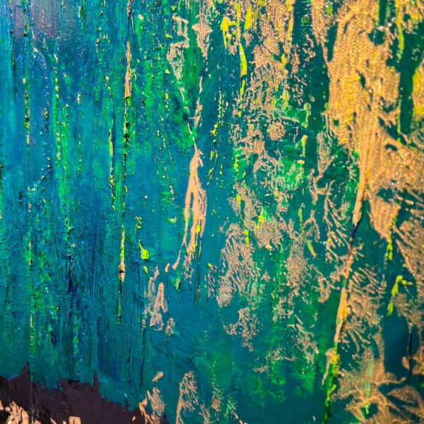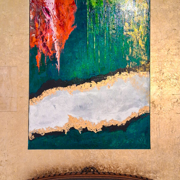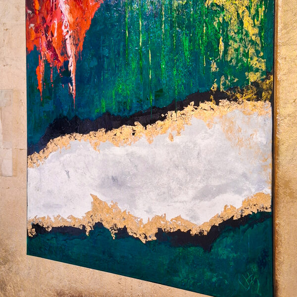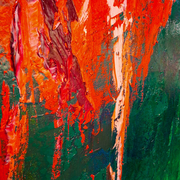 Entre los rojos y negros irrumpen manchas turquesas, como luces celestes que destellan sobre una herida: simbolizan a la vez el breve resplandor de la esperanza y los giros implacables del destino, pero también aluden a la presencia espiritual y anímica de Hefestión. Esas luces frías evocan no solo la razón y la camaradería del estratega, sino también la pureza intemporal del vínculo íntimo entre hombres.